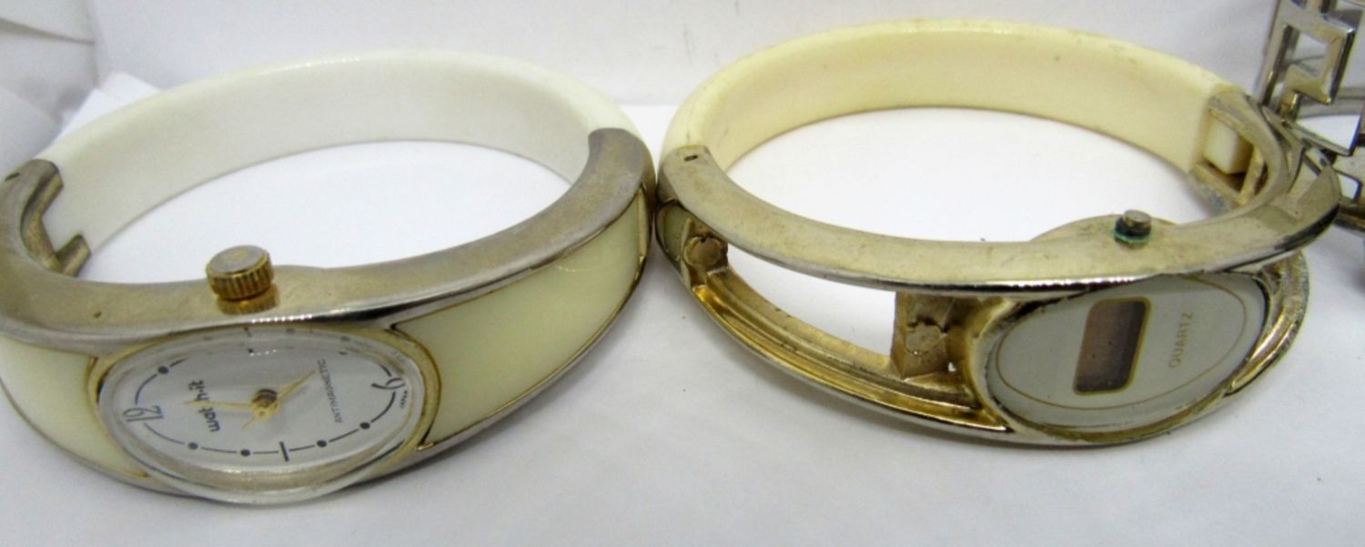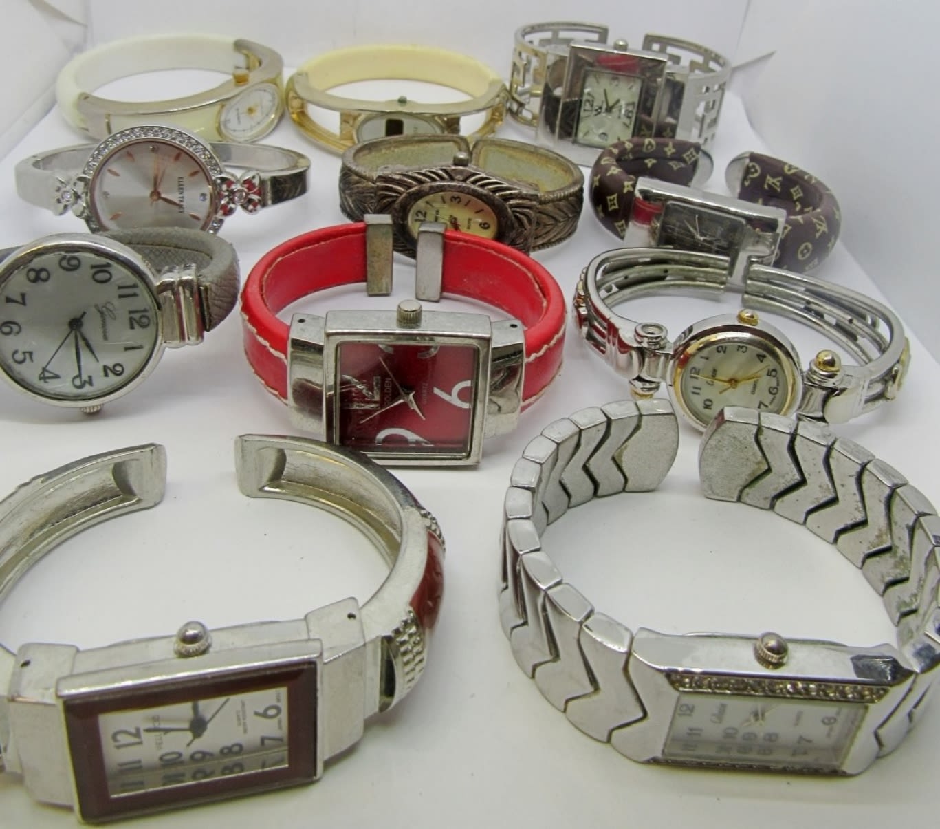 Lots of variety in brands and designs. Includes one digital piece and one inauthentic Louis Vuitton cuff. Good fashion watches, all untested as to working.