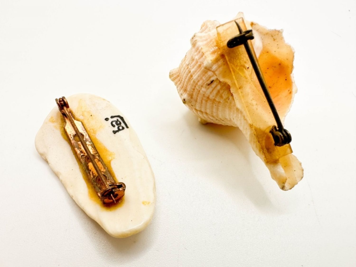 SHELL AND SHIP BROOCHES, NAUTICAL , HJAND PAINTED SHIP, SIGNED