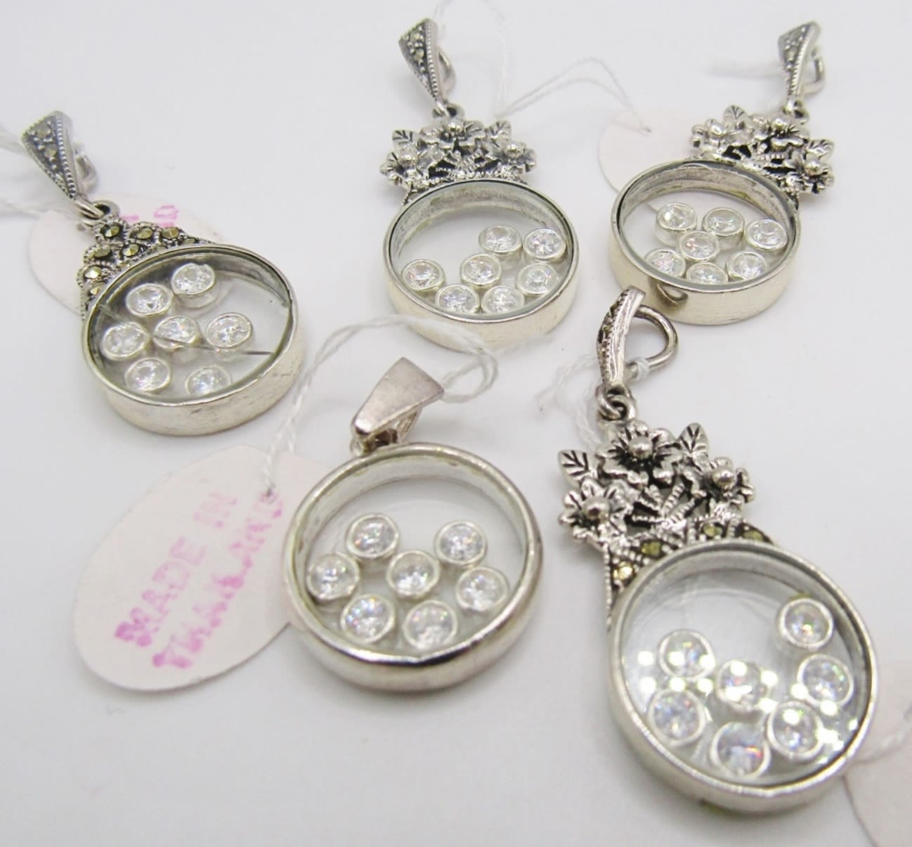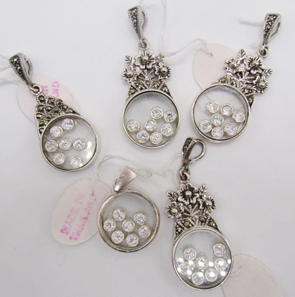 With Rhinestones charms in the middles, with marcasite stones on the outside with, some with flower design on outside, 15 dwt