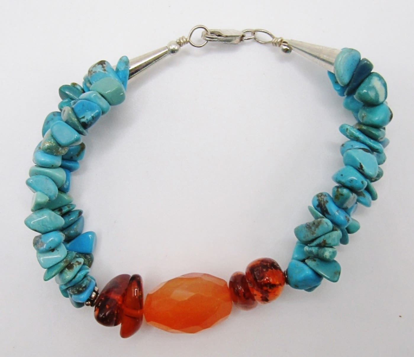 BEADED BRACELET WITH BALTIC AMBER STONE ACCENTS- STERLING CLASP – MEASURES 7 INCHES