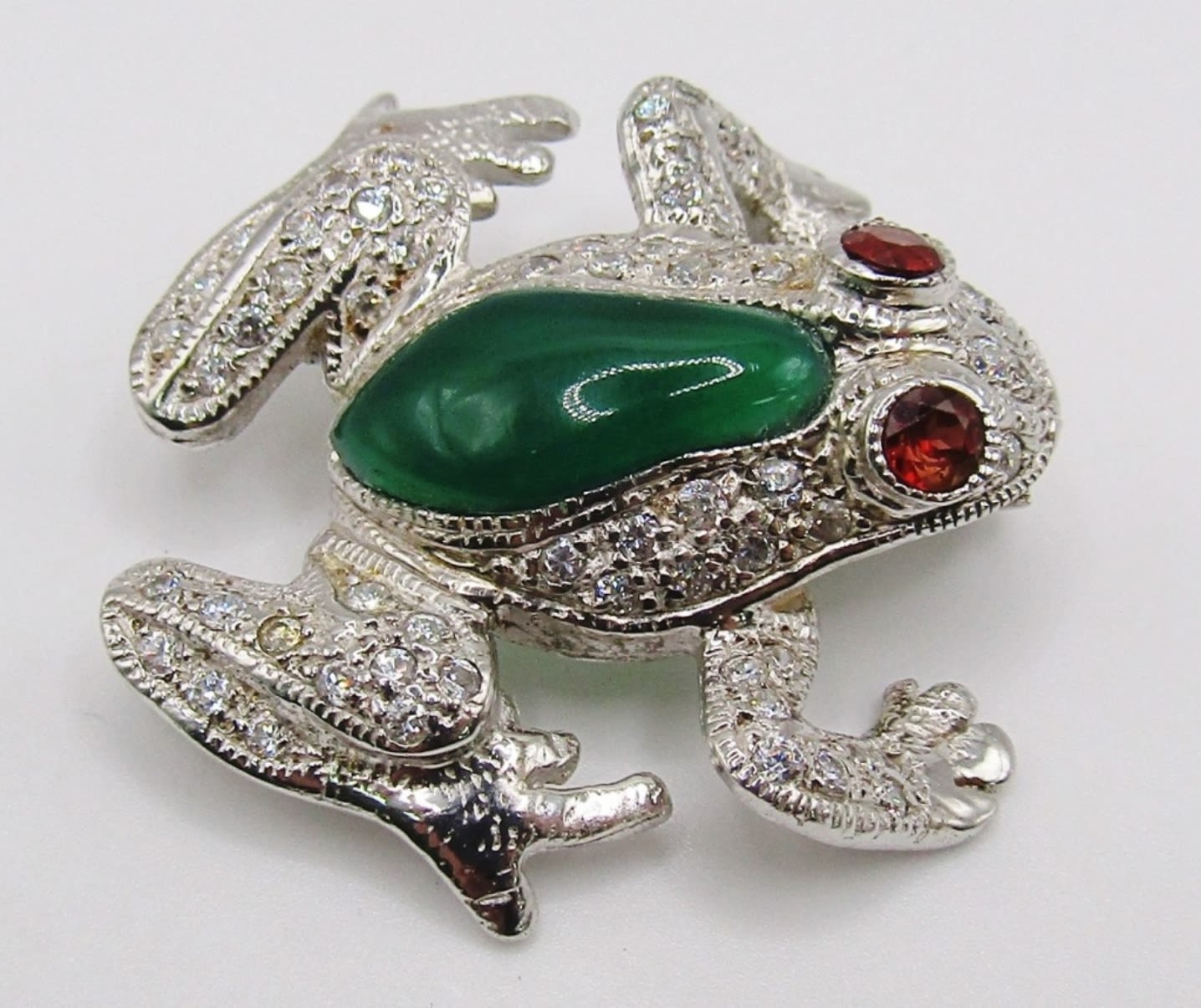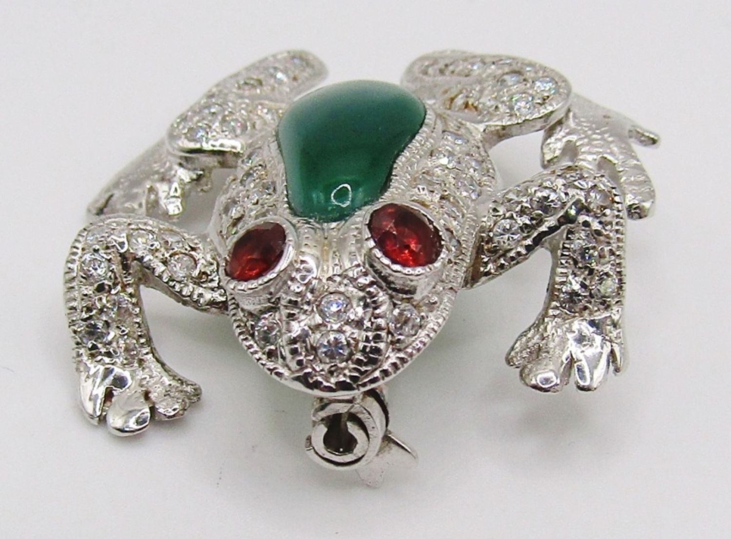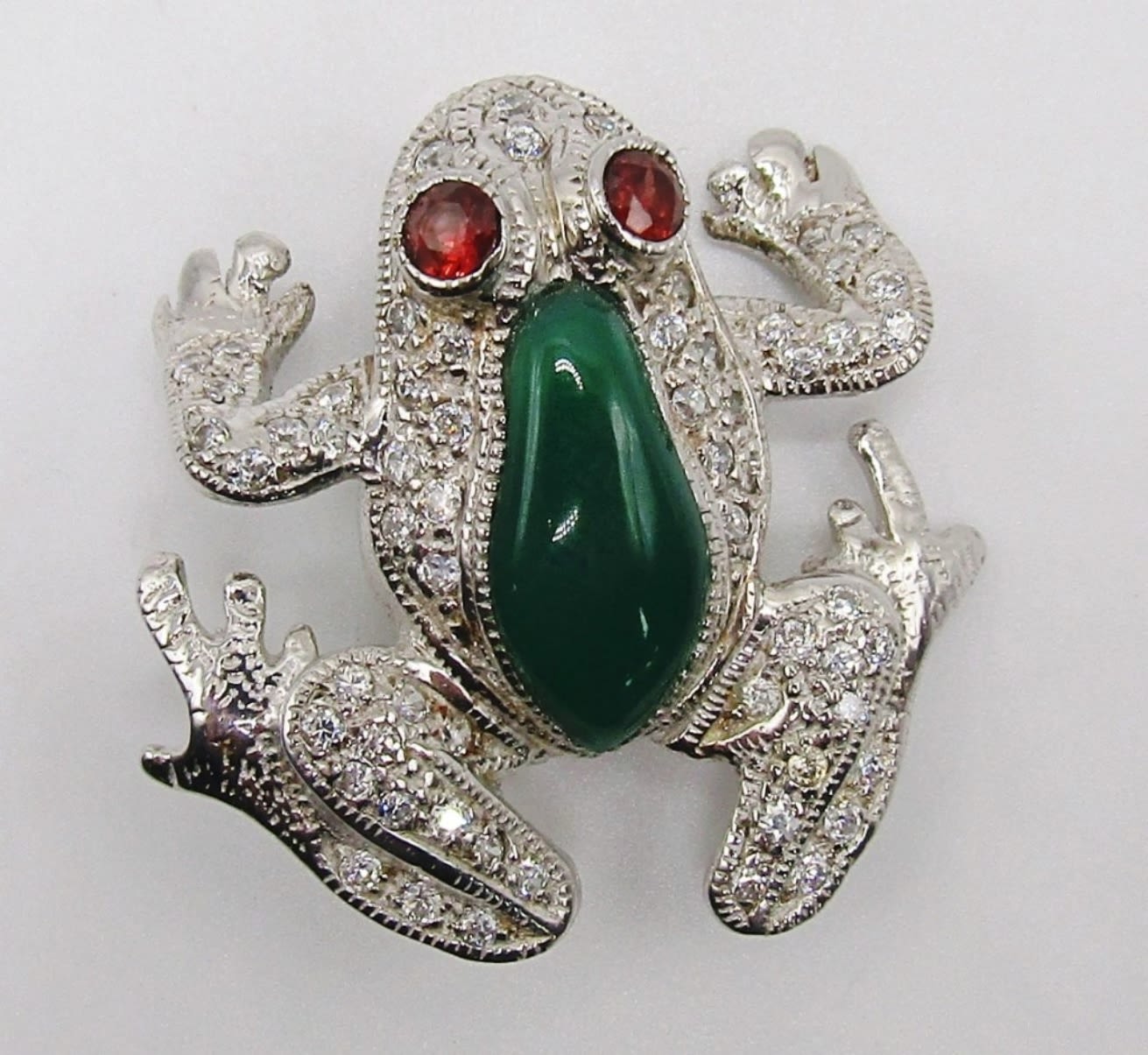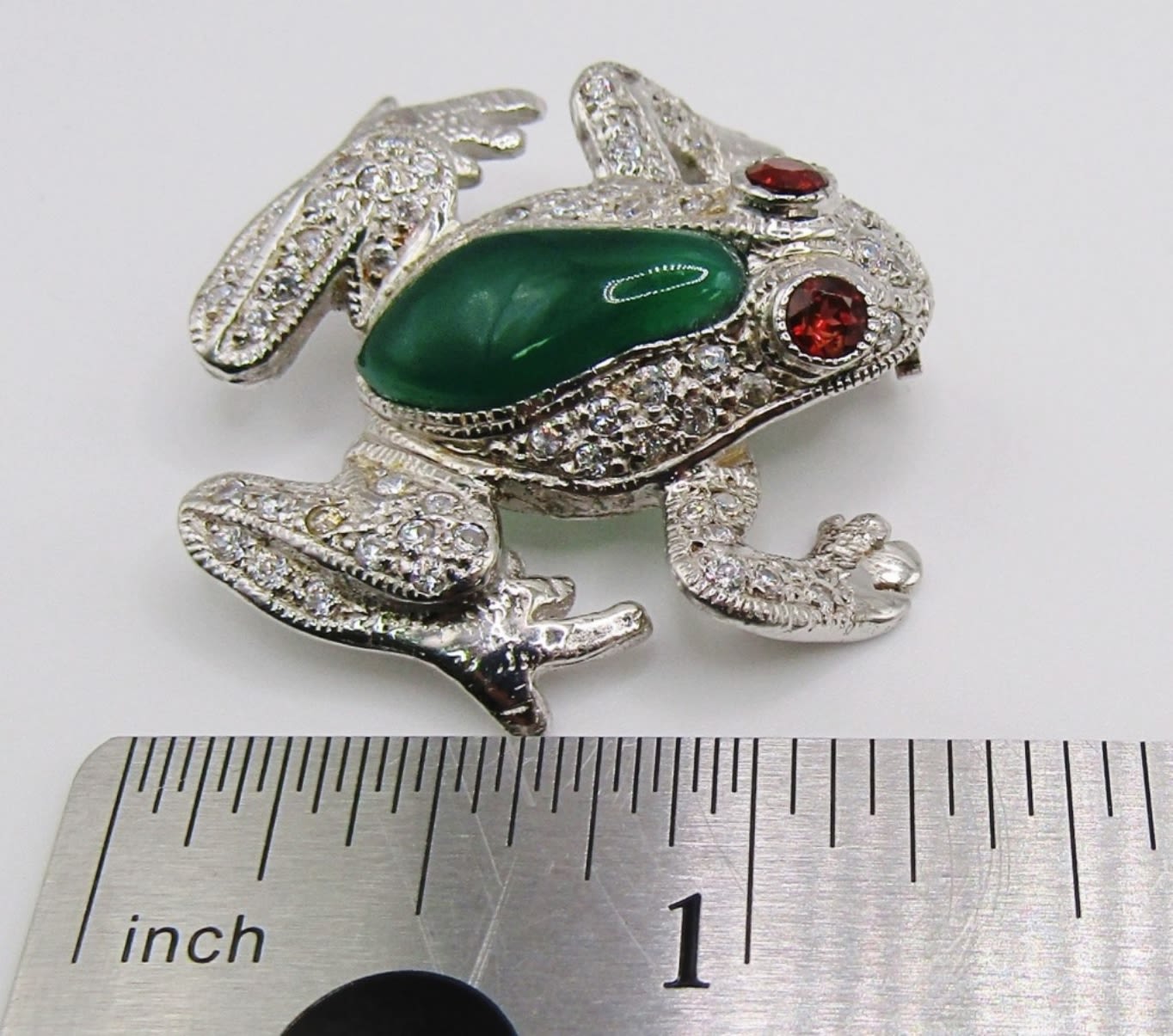 jade stone on the back of frog with red stones for eyes, clear stones around rest of pin, 8Dwt
