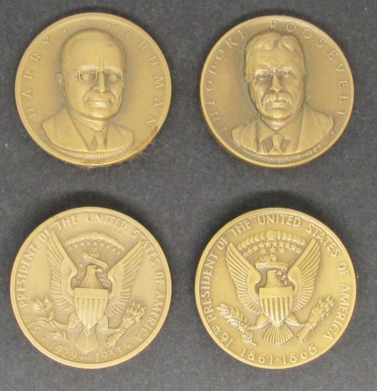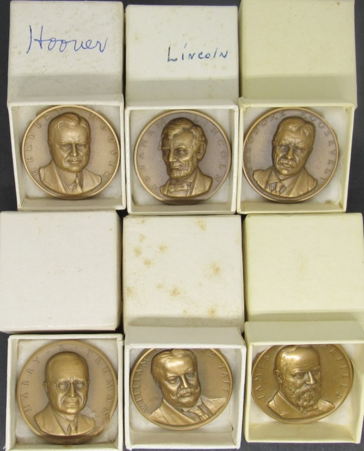 BEAUTIFUL 3-D VINTAGE PRESIDENTIAL ART MEDALS – ALL WITH ORIGINAL BOXES – ROOSEVELT, LINCOLN, TAFT, GARFIELD, HOOVER, TRUMAN