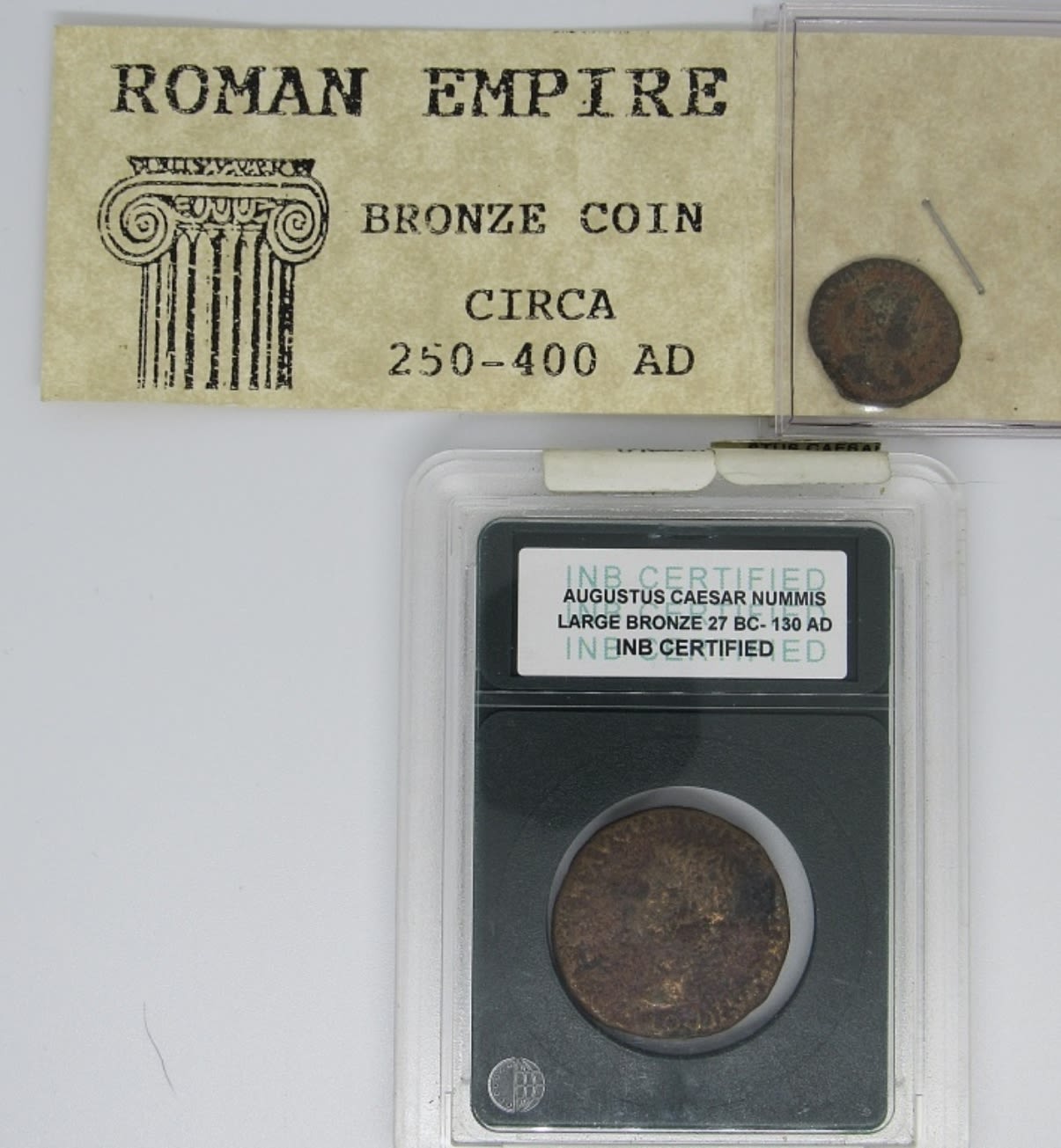 EARLY ROMAN EMPIRE COINS – AUGUSTUS CAESAR NUMMIS LARGE BRONZE & BRAONZE COIN CIRCA 250-400 AD