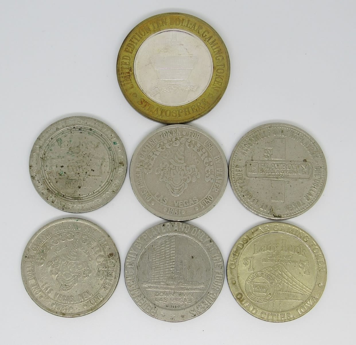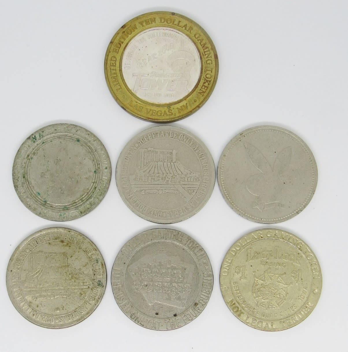 (6) CASINO TOKENS CLAD (1) PLAYBOY BUNNY
