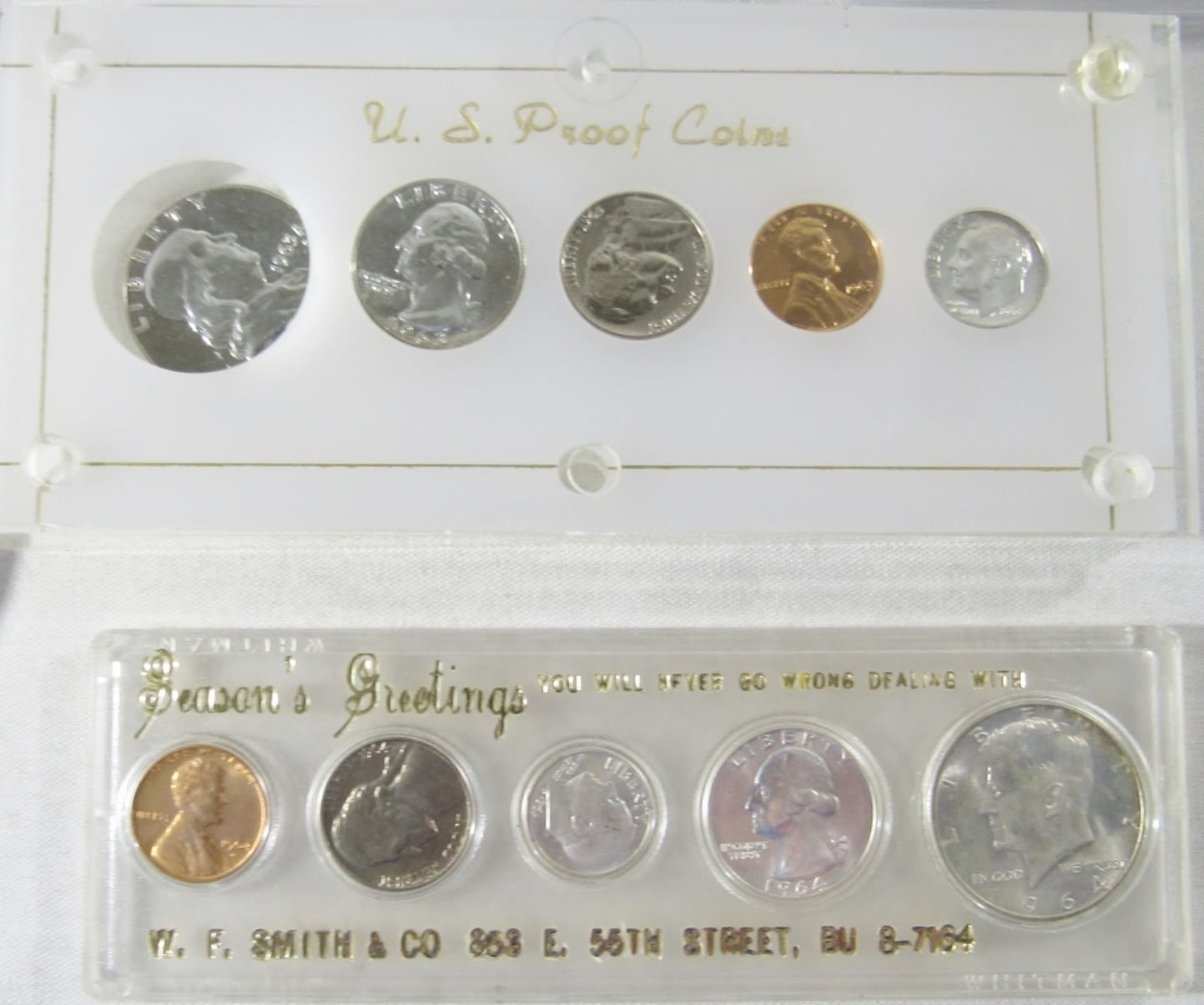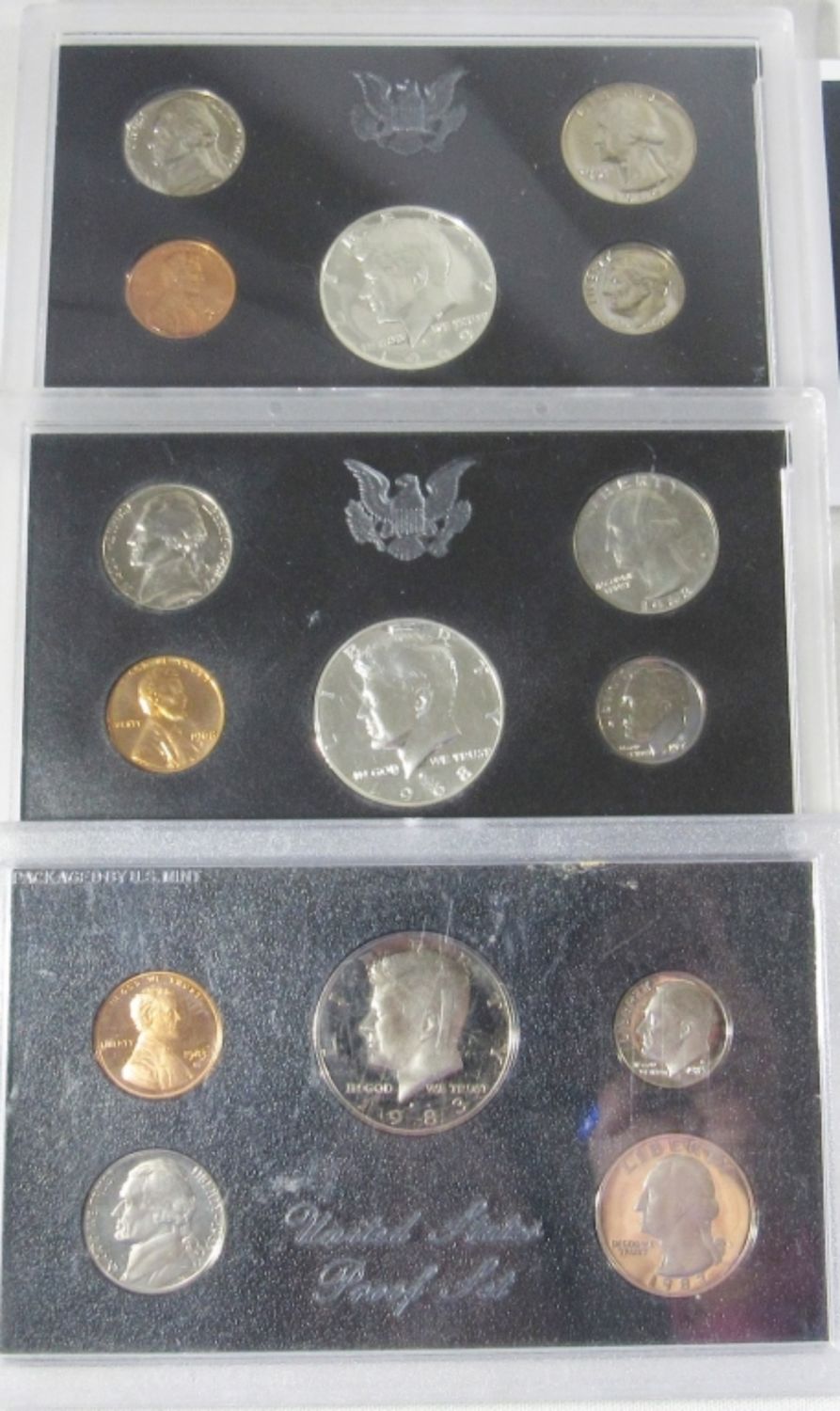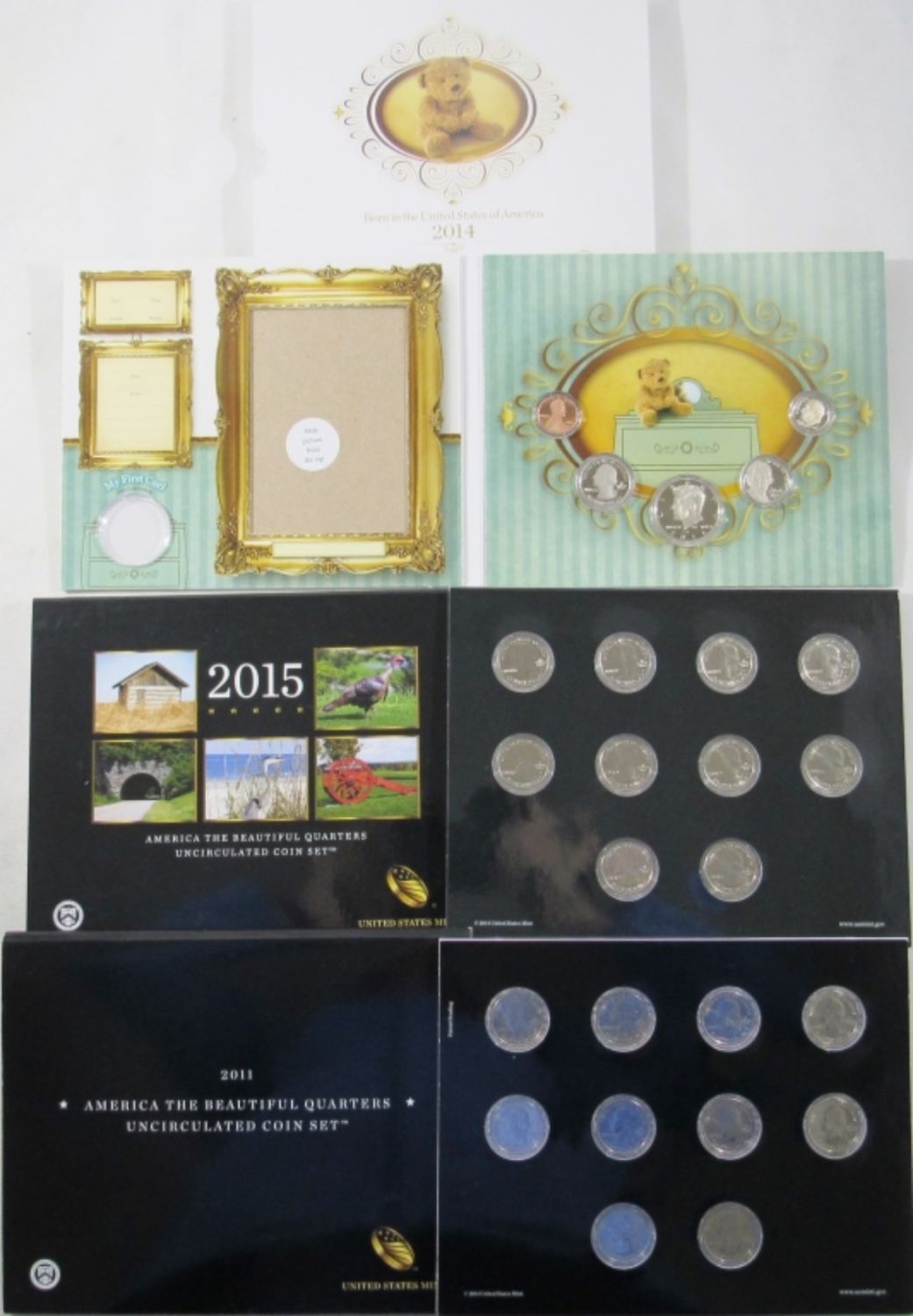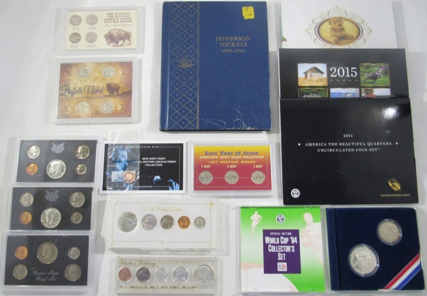 44 CIRC NICKELS IN ALBUM, 2011 & 2015 UNC AM. THE BEAUTIFUL QTRS SETS, 2014 BORN IN THE UNITED STATES OF AMERICA BABY SET, 94 WORLD CUP COLLECTORS SET, 3-NICKEL SETS IN PLASTIC, 1968, 69, & 83 PROOF SETS MISSING OUTER BOX,