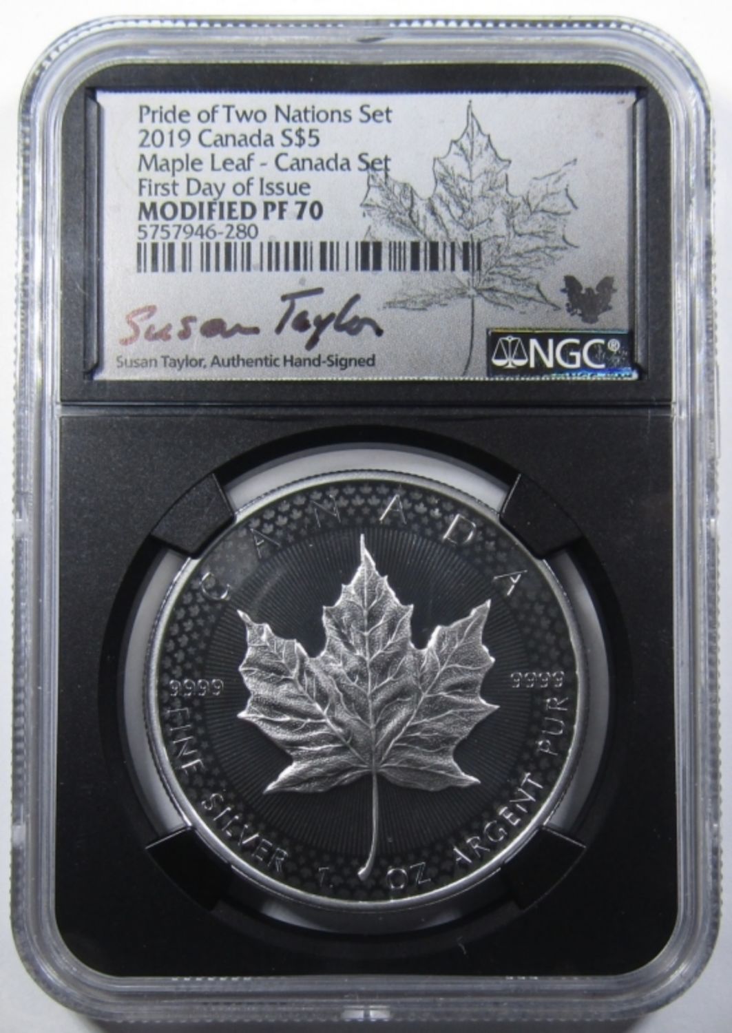 MODIFIED PF-70, FIRST DAY OF ISSUE, SUSAN TAYLOR SIGNED. FROM PRIDE OF TWO NATIONS SET. CANADA SET. 1oz .999 SILVER.