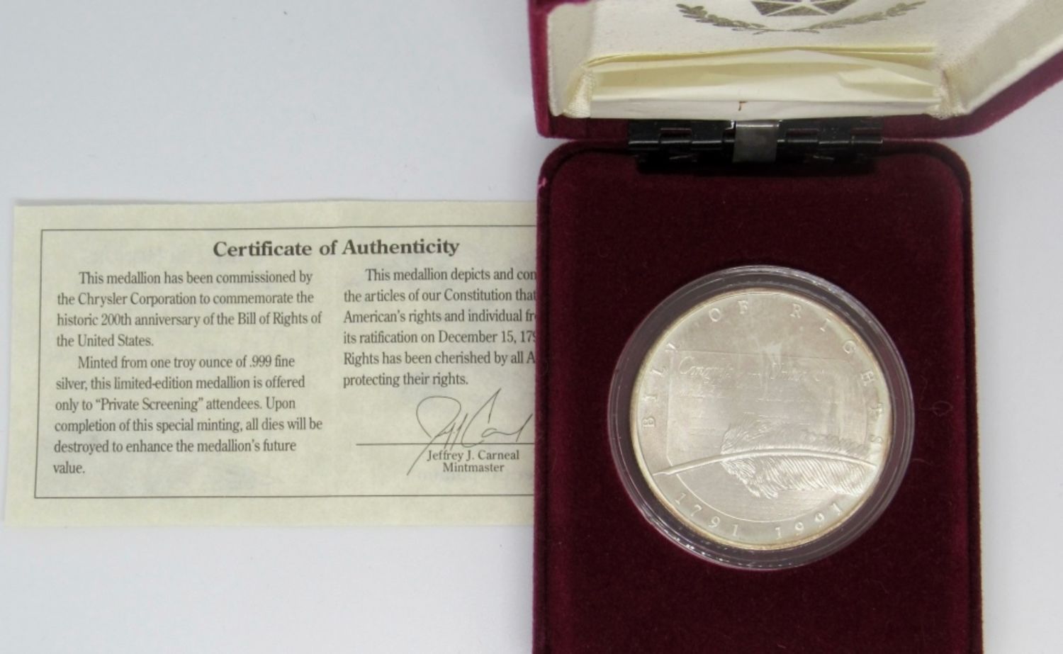.999 SILVER CHRYSLER CORPORATION COMMEMORATIVE MEDALLION, LIBERTY MINT, WITH VELVET CASE & COA.