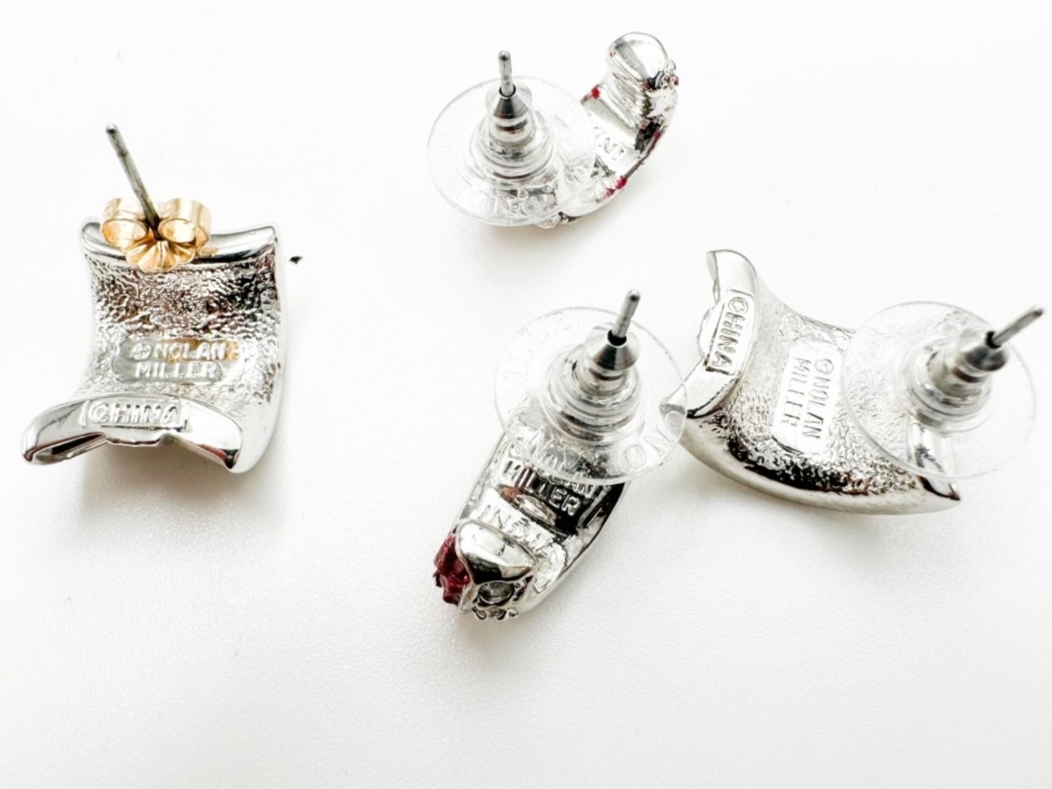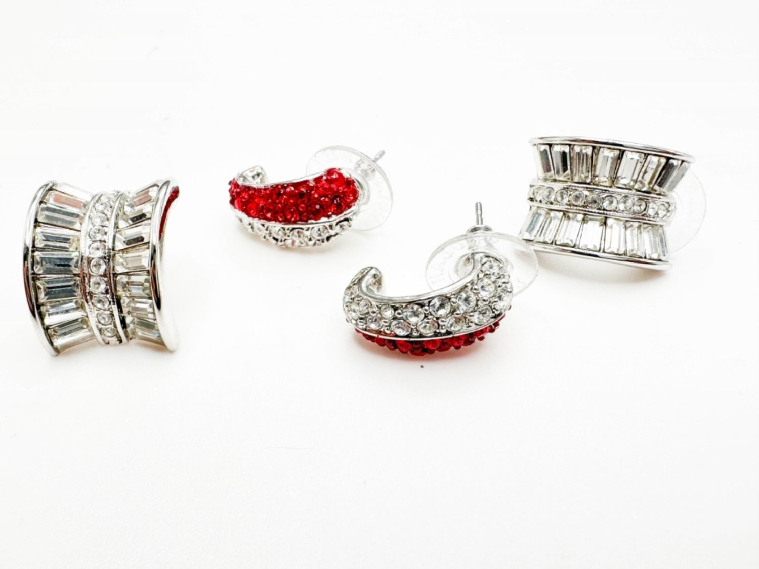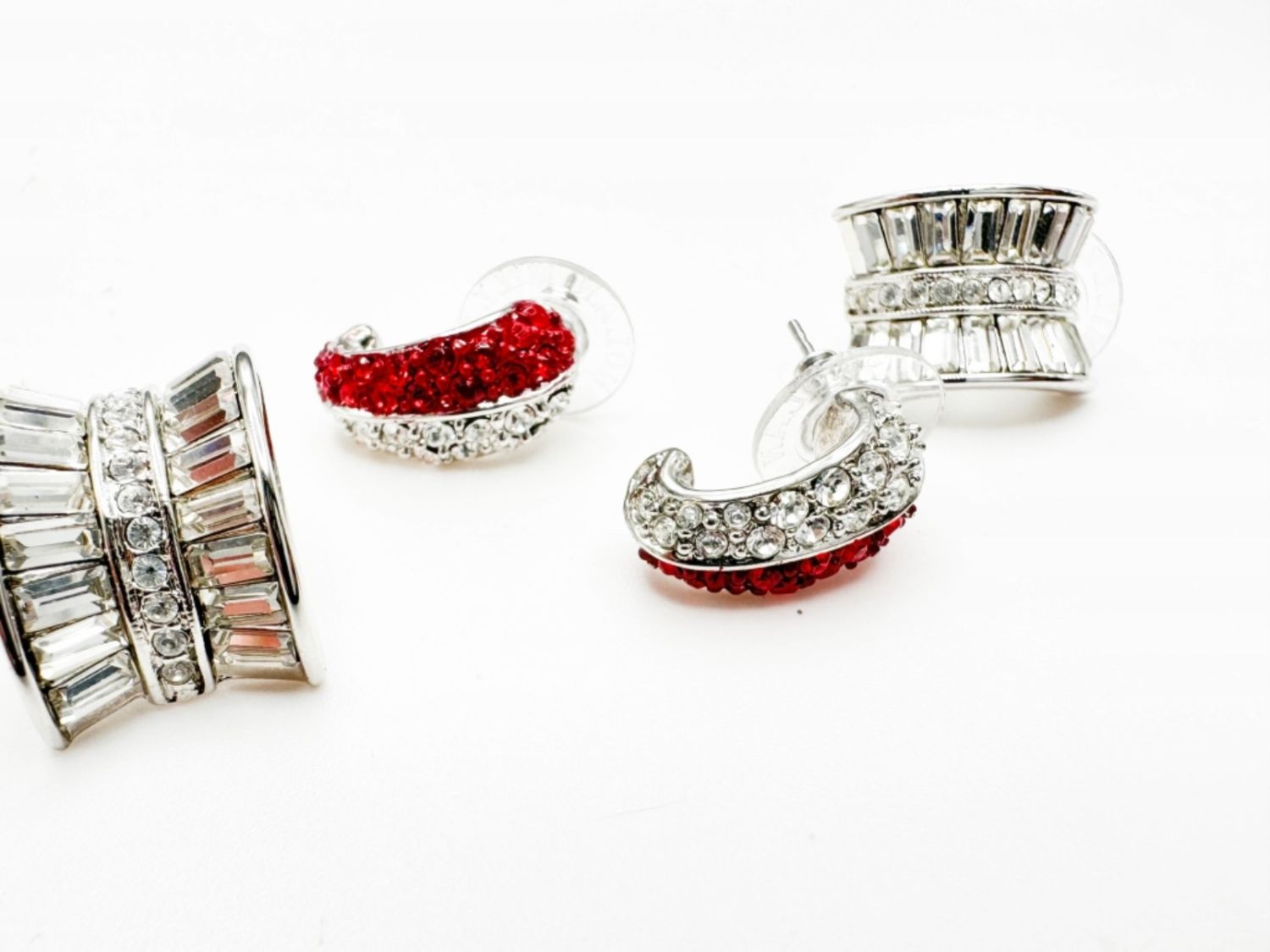NOLAN MILLER EARRINGS SETS, ONE SETS CLEAR STONES, ONE SETS RED AND WHITE STONES, SIGNED VINTAGE NOLAN MILLER