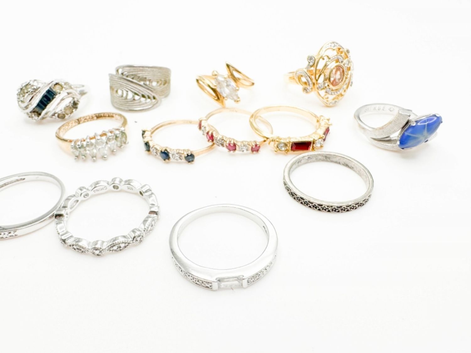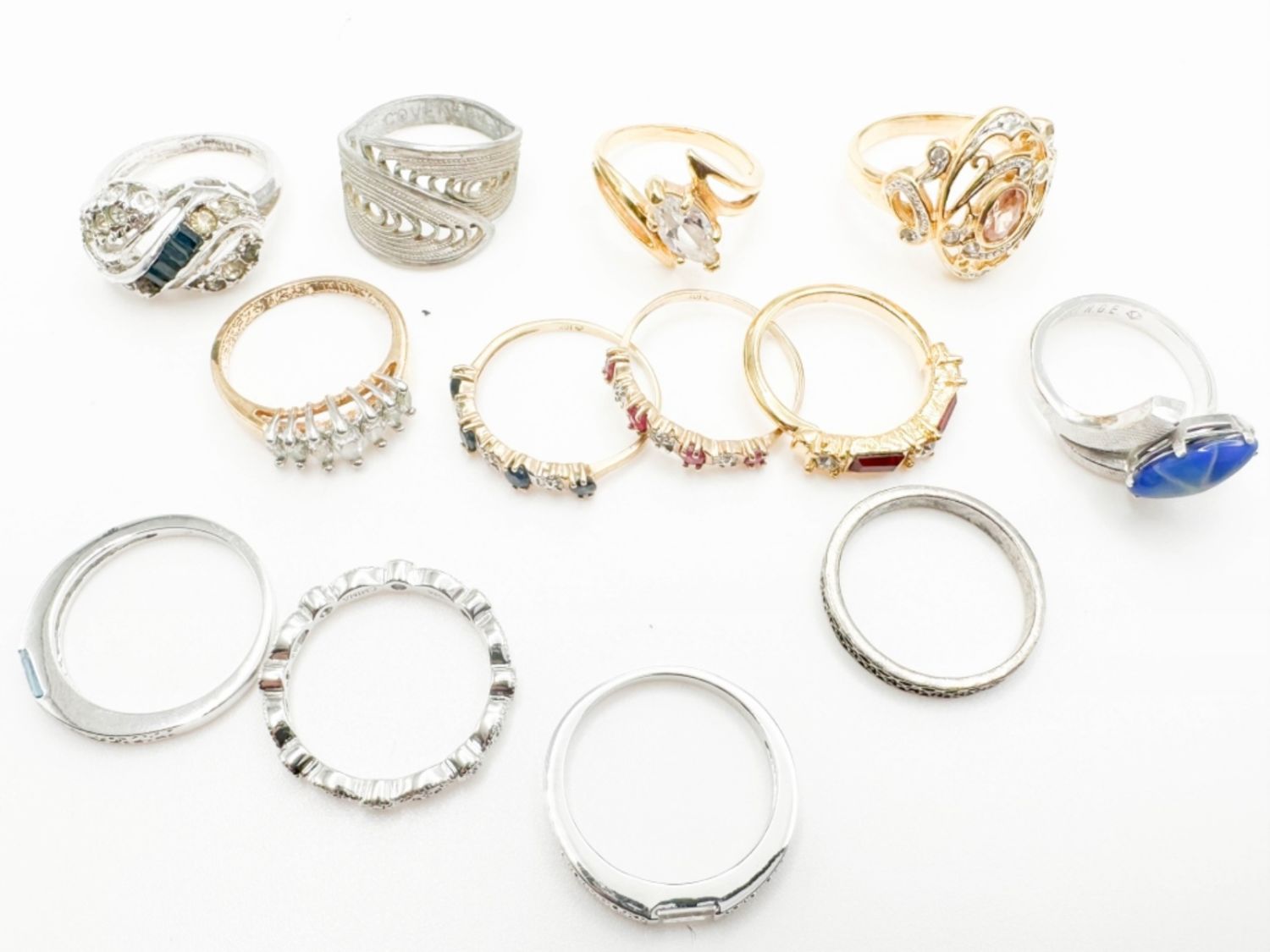 RINGS ASSORTMENT, ALL STYLES, SIZES AND CONDITIONS, MANY WITH STONES