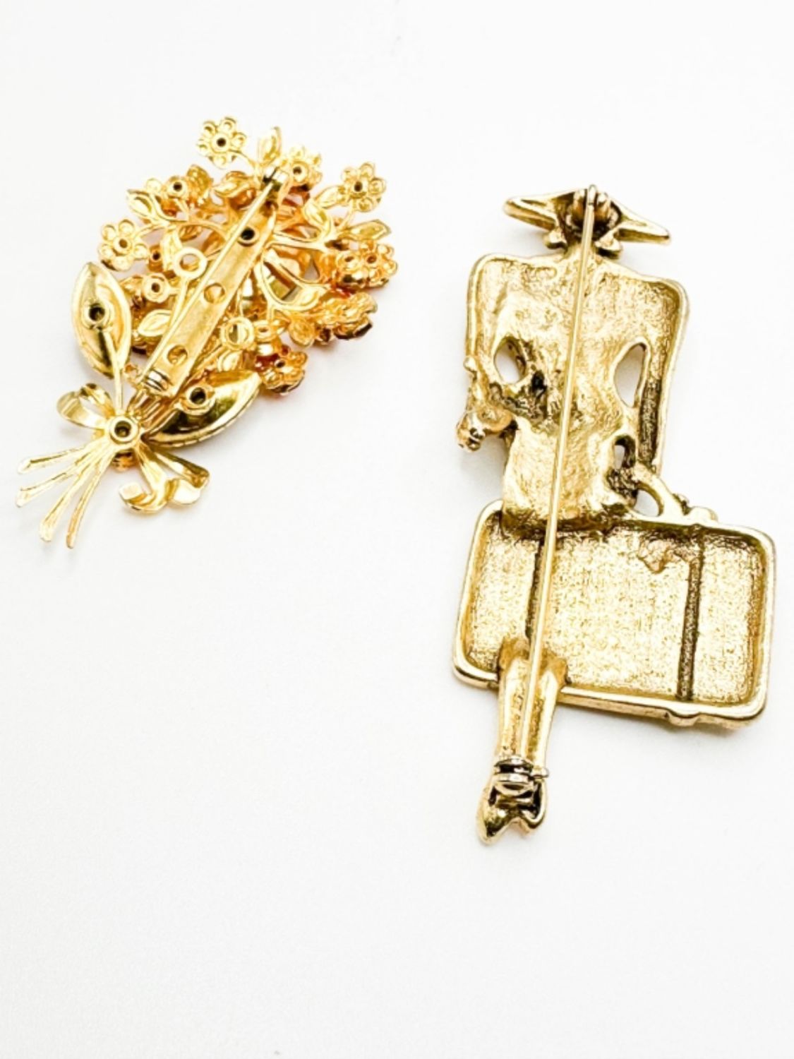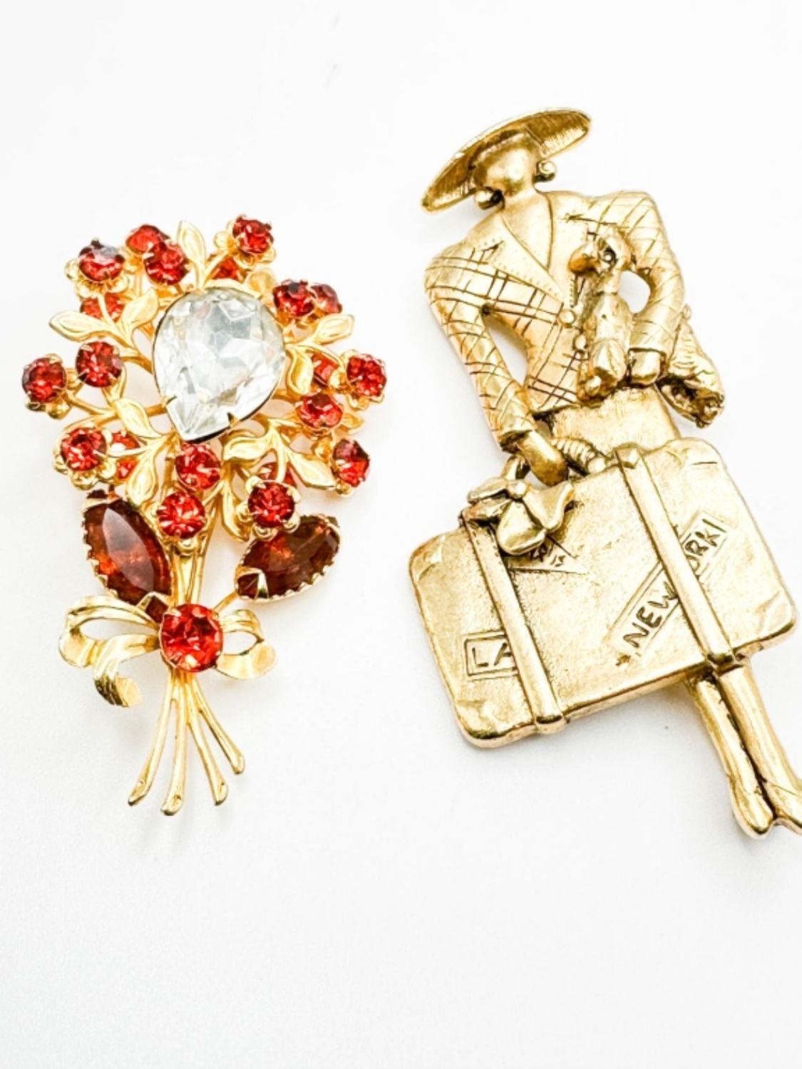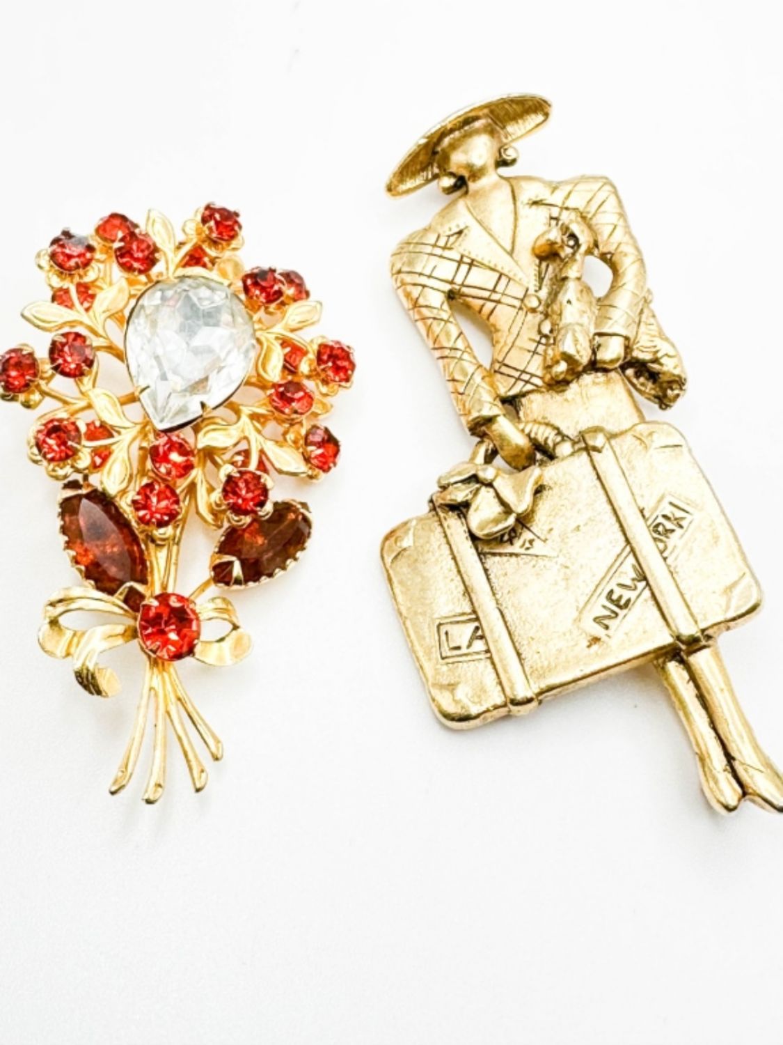VINTAGE BROOCHES, ONE FLORAL STONE BROOCH, ONE PARISIAN TRAVELER BROOCH