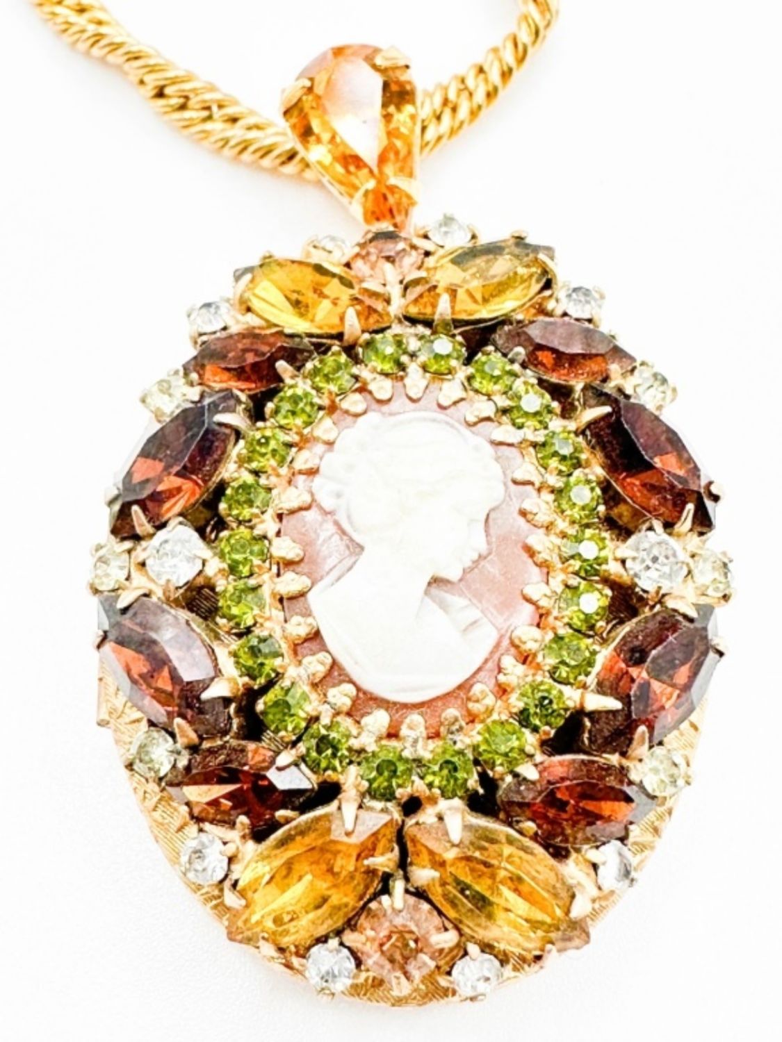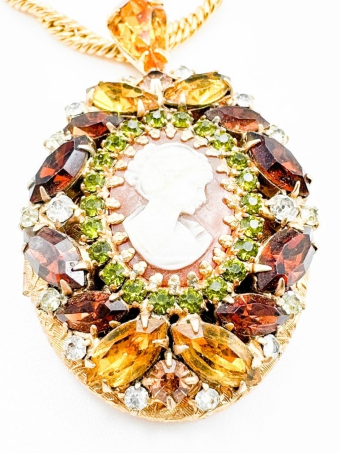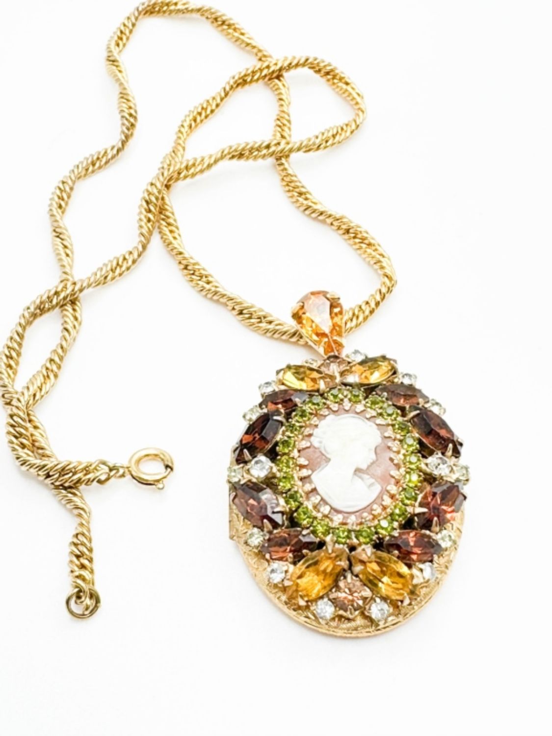 HOBE VINTAGE LOCKET NECKLACE WITH COLOR STONES AND CAMEO CENTER , AWESOME !!!!