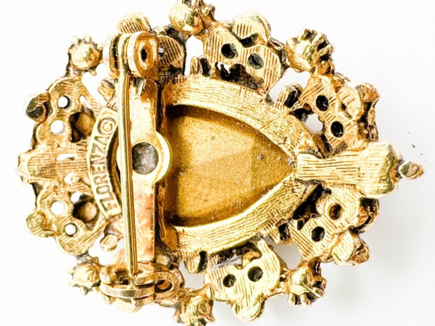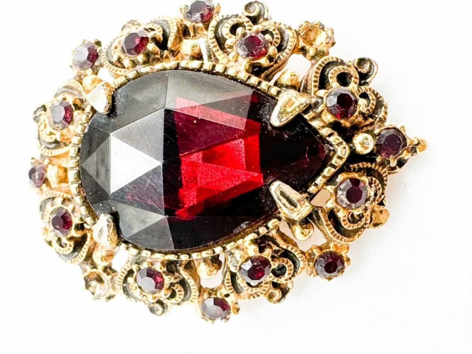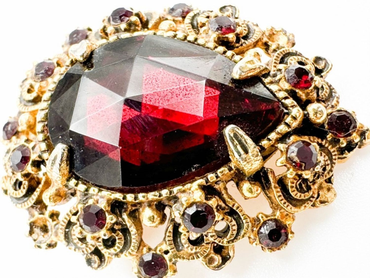FLORENZA RUBY RED STONE BROOCH WITH INTRICATE DETAILING , WOW