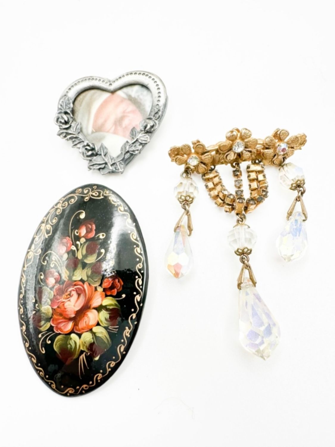 HANDPAINTED FLORAL BROOCH AND HEART BROOCH AND EARRINGS SET