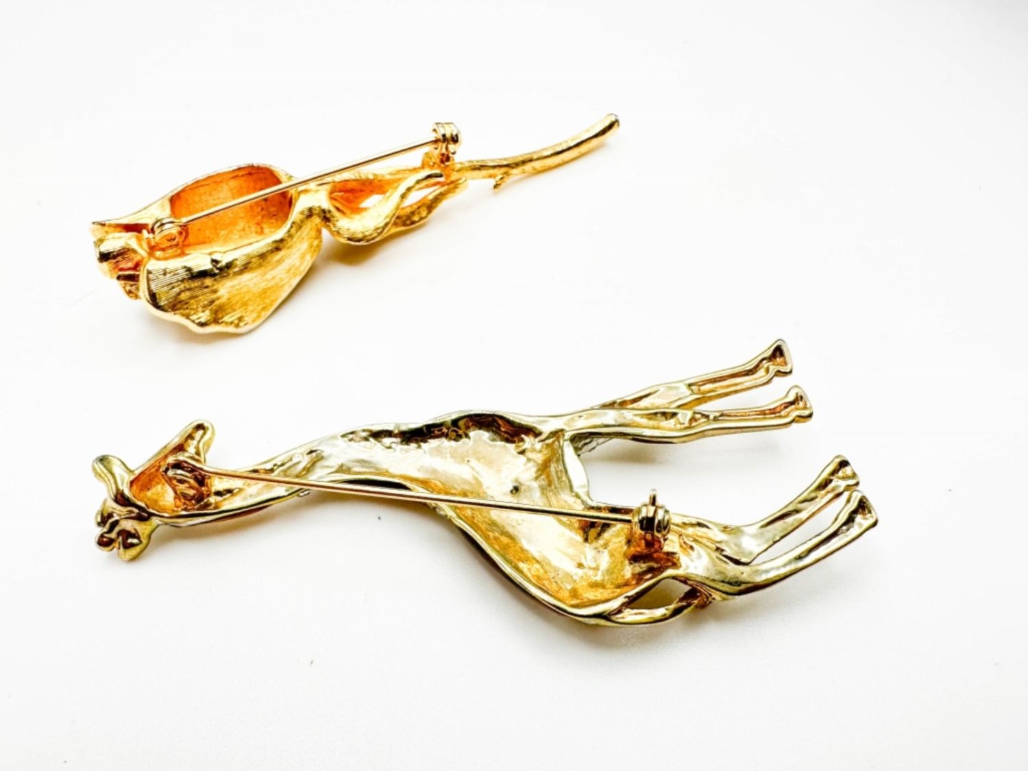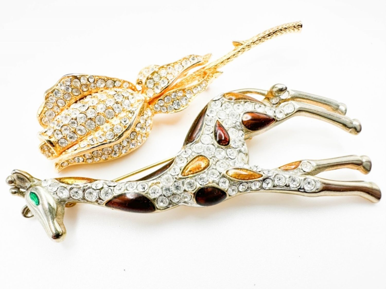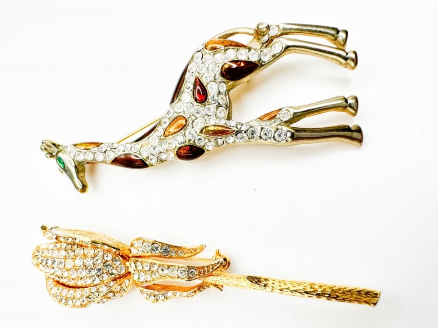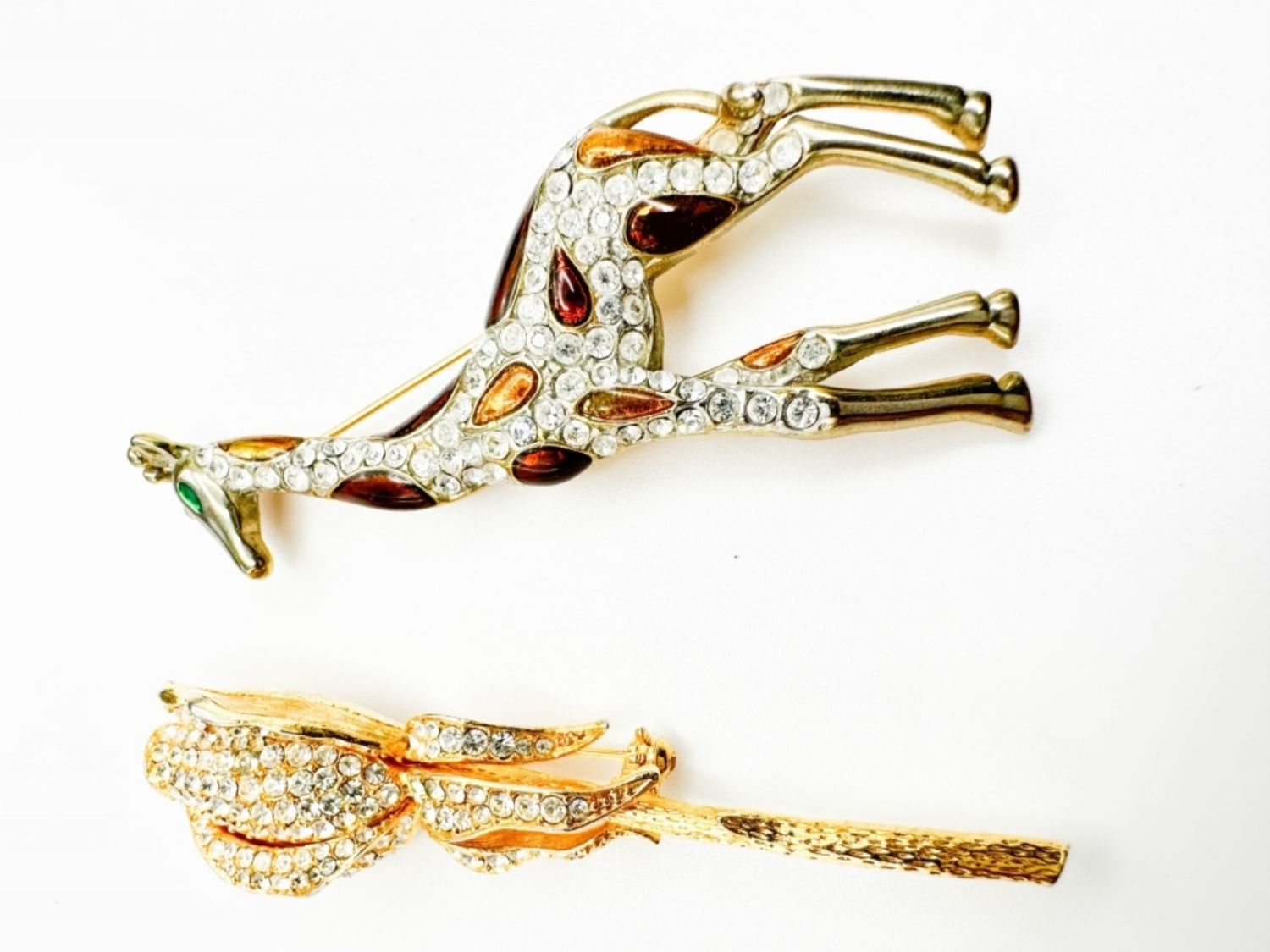 GIRAFFE WITH GREEN EYES AND COLOR STONES BROOCH, FLORAL BLOOM BUD BROOCH WITH CLEAR STONES