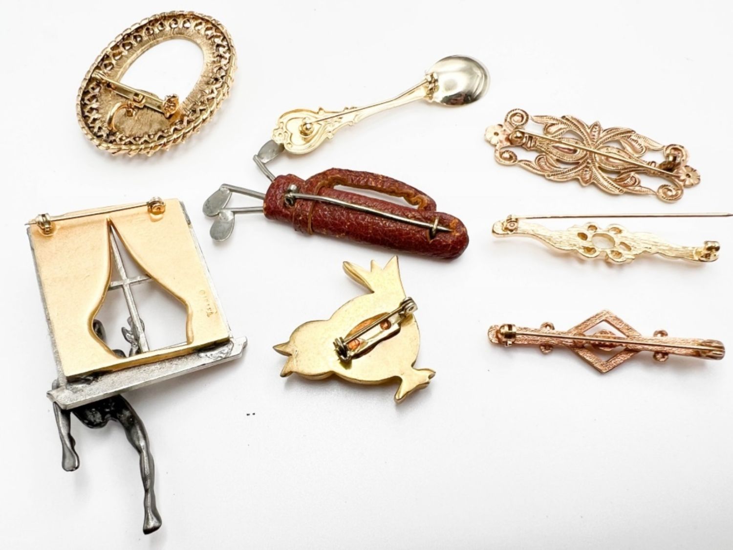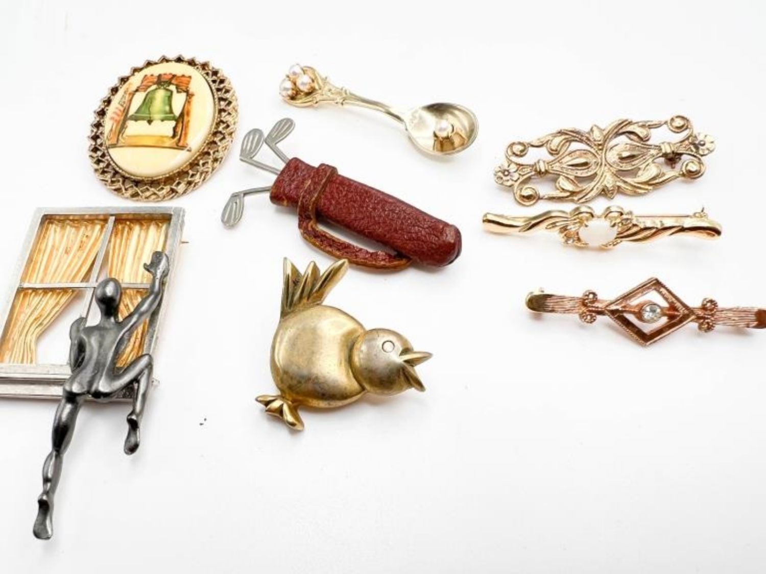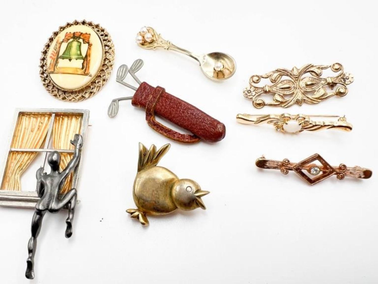 BROOCH ASSORTMENT GOLF CLUBS WINDOW BIRD SPOON AND MORE