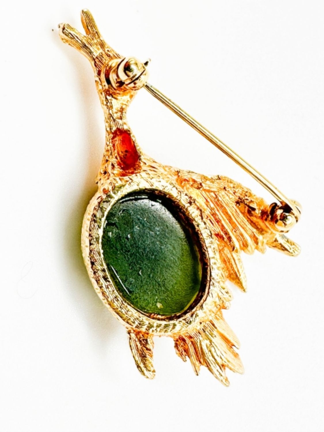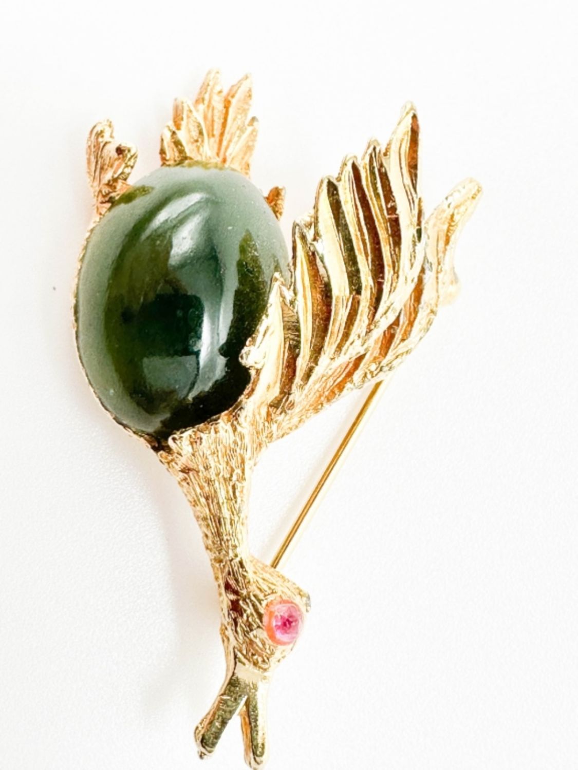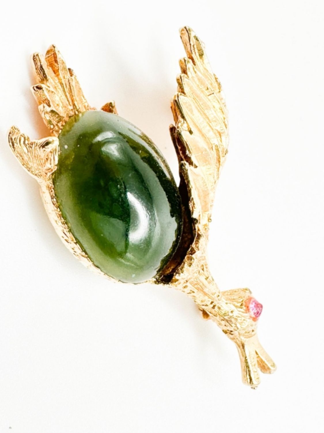 JELLY BELLY BIRD BROOCH WITH PINK EYES AND LARGE GREEN STONE BELLY . VINTAGE, AMAZING