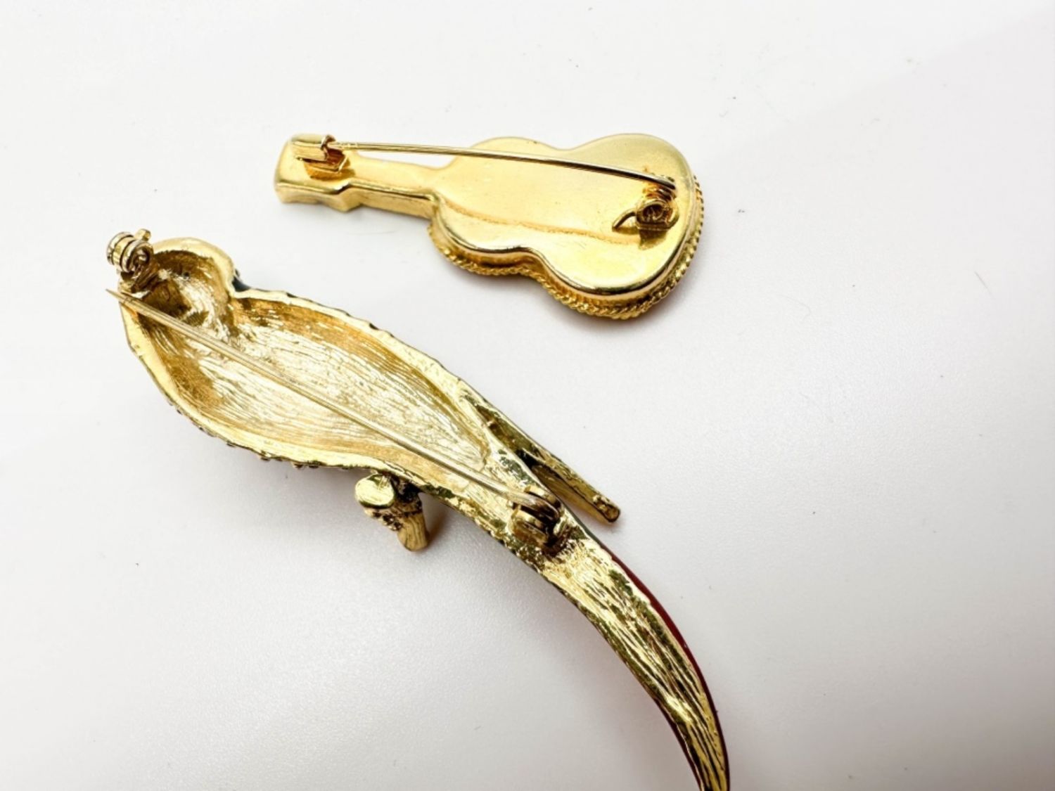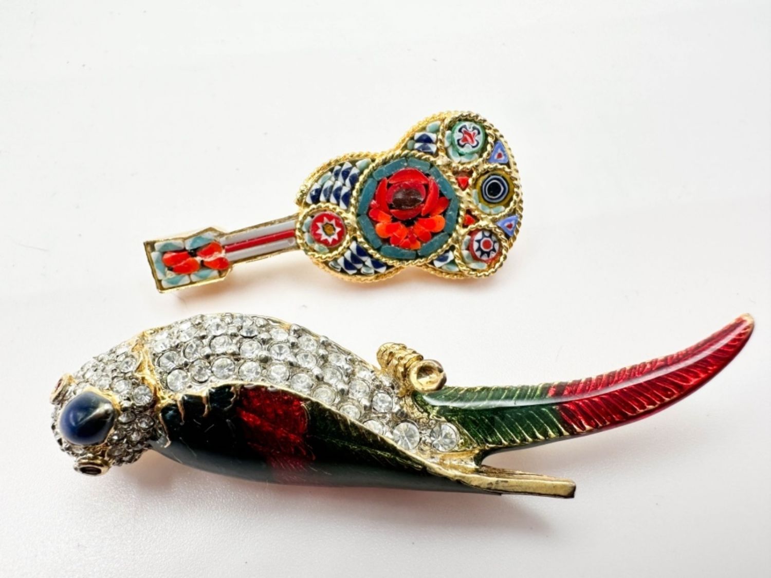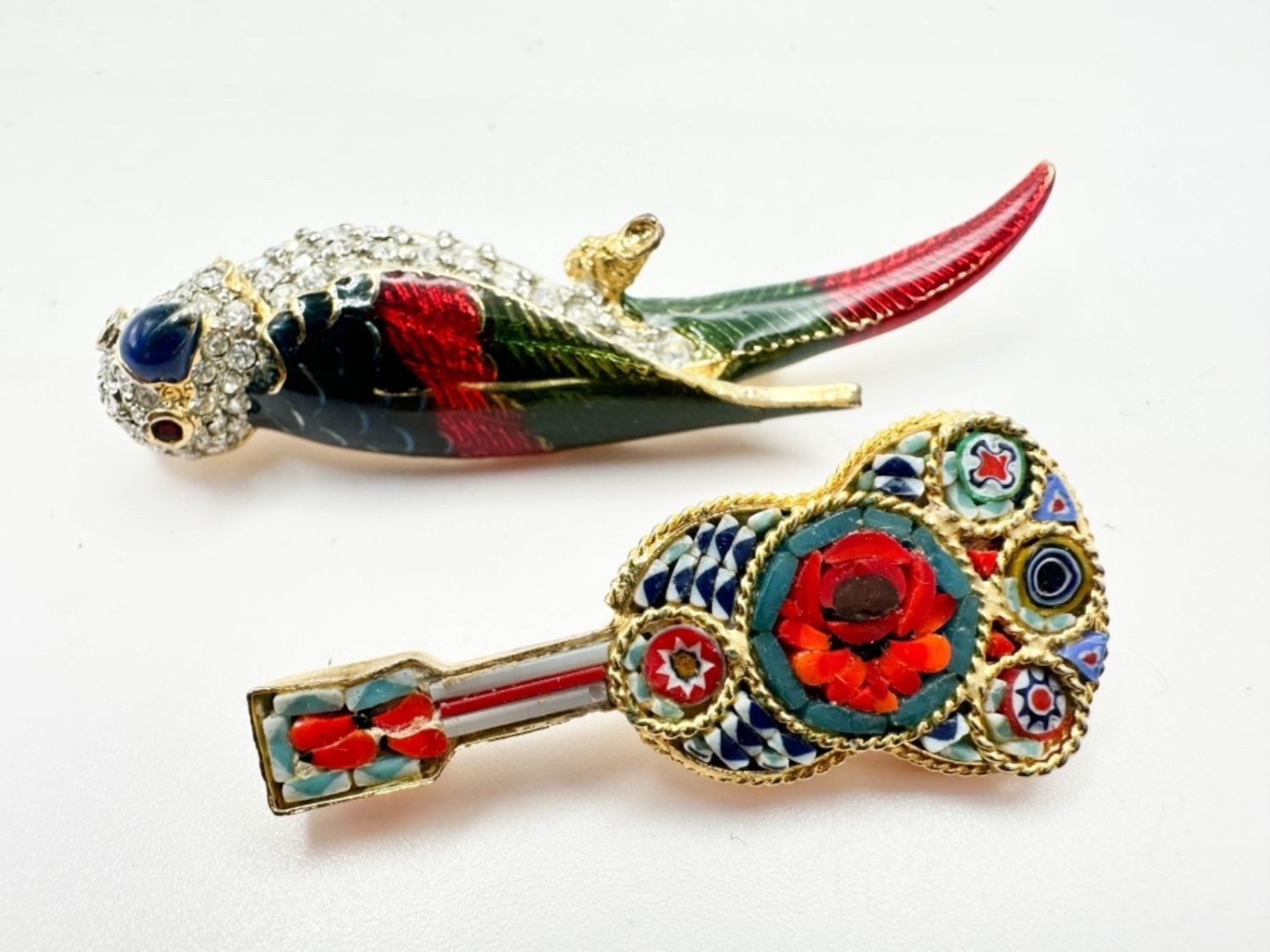 MOSAIC GUITAR AND PARROT STONE BROOCH
