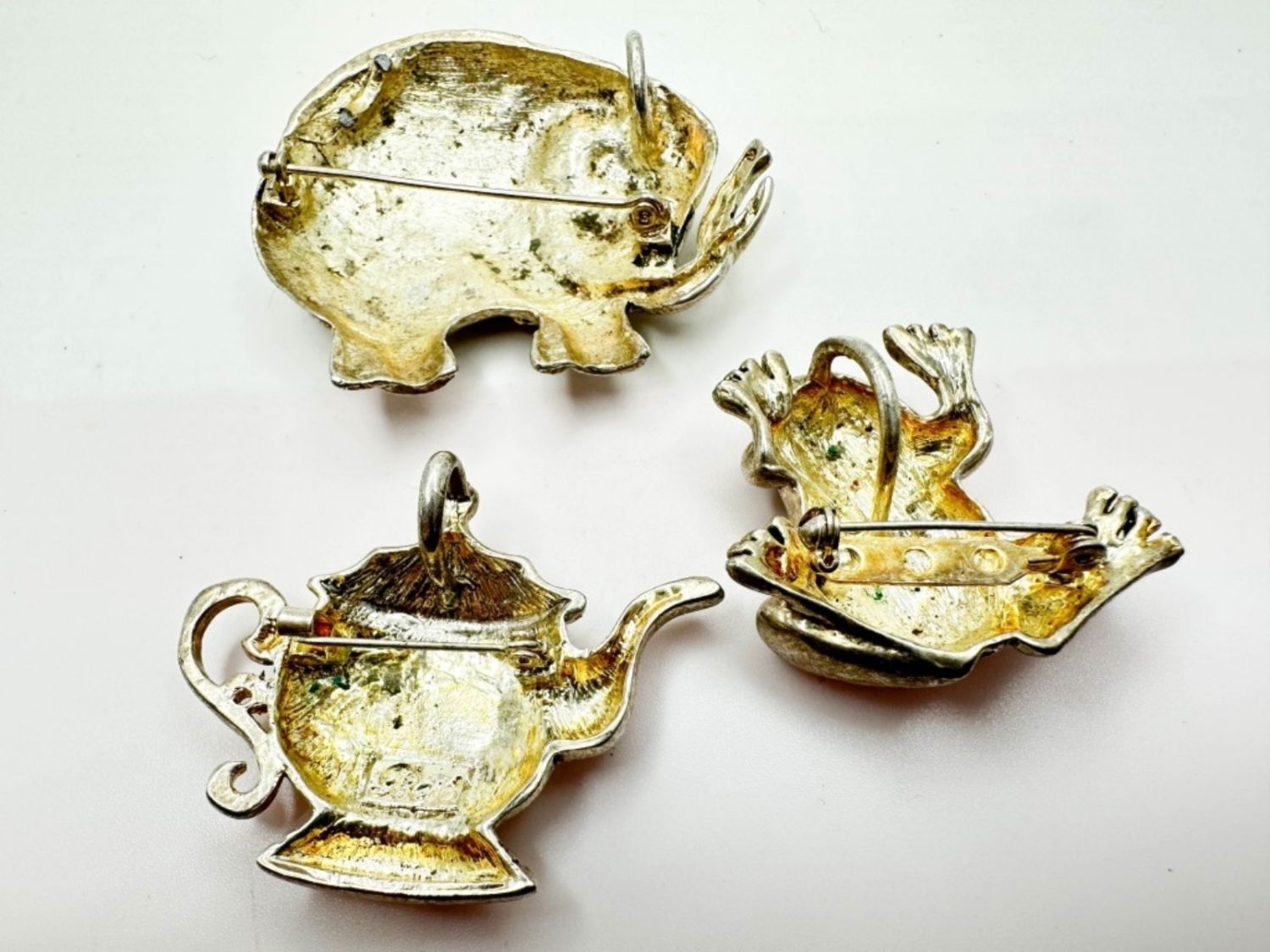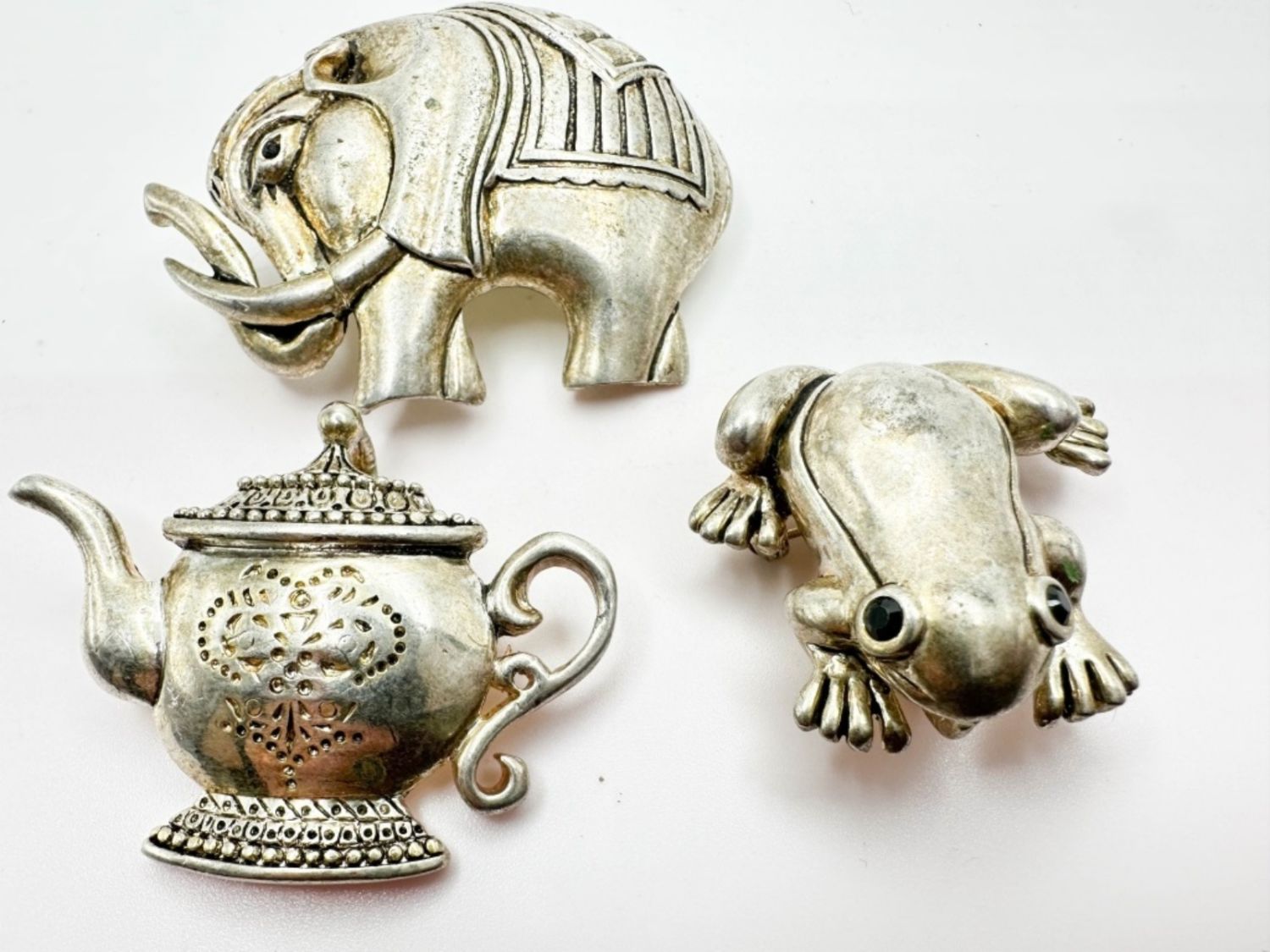 BROOCH TRIO TEAPOT FROG AND ELEPHANT