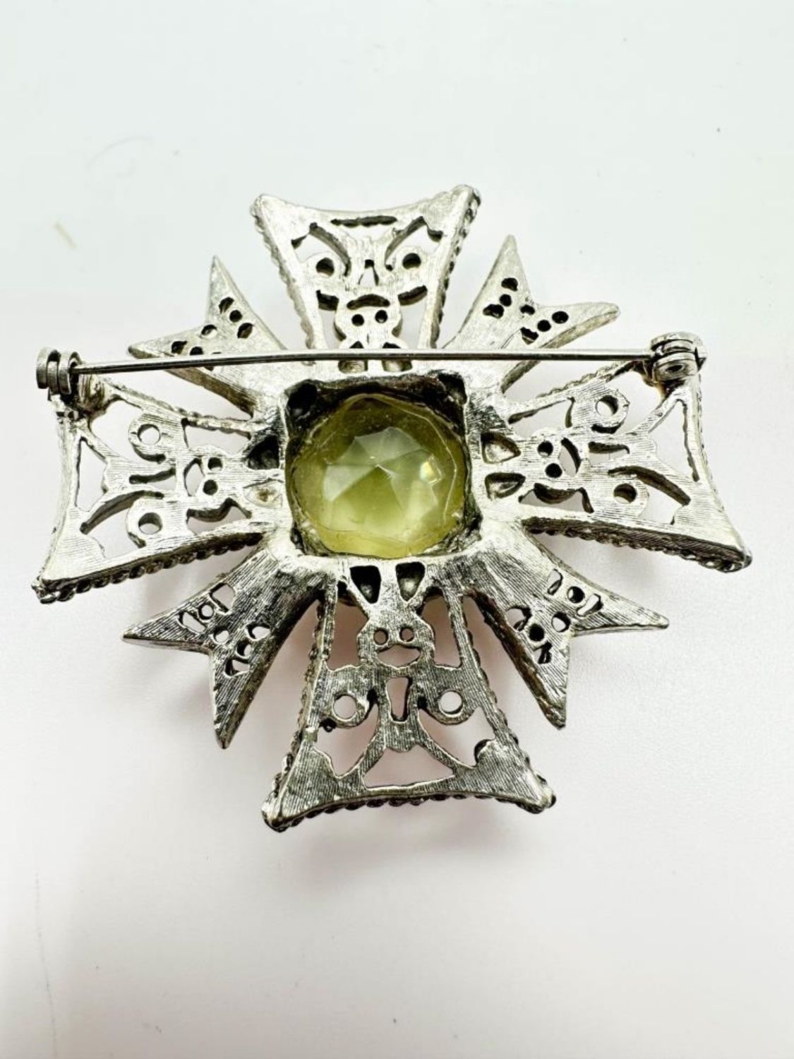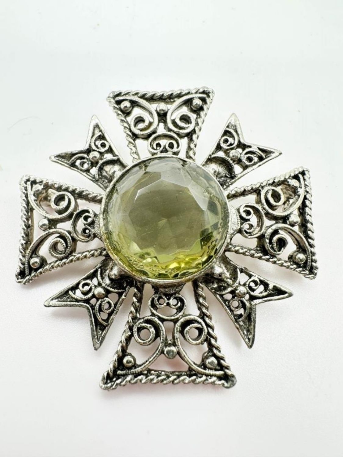 MALTESE CROSS BROOCH W LARGE CENTER. FACETED STONE