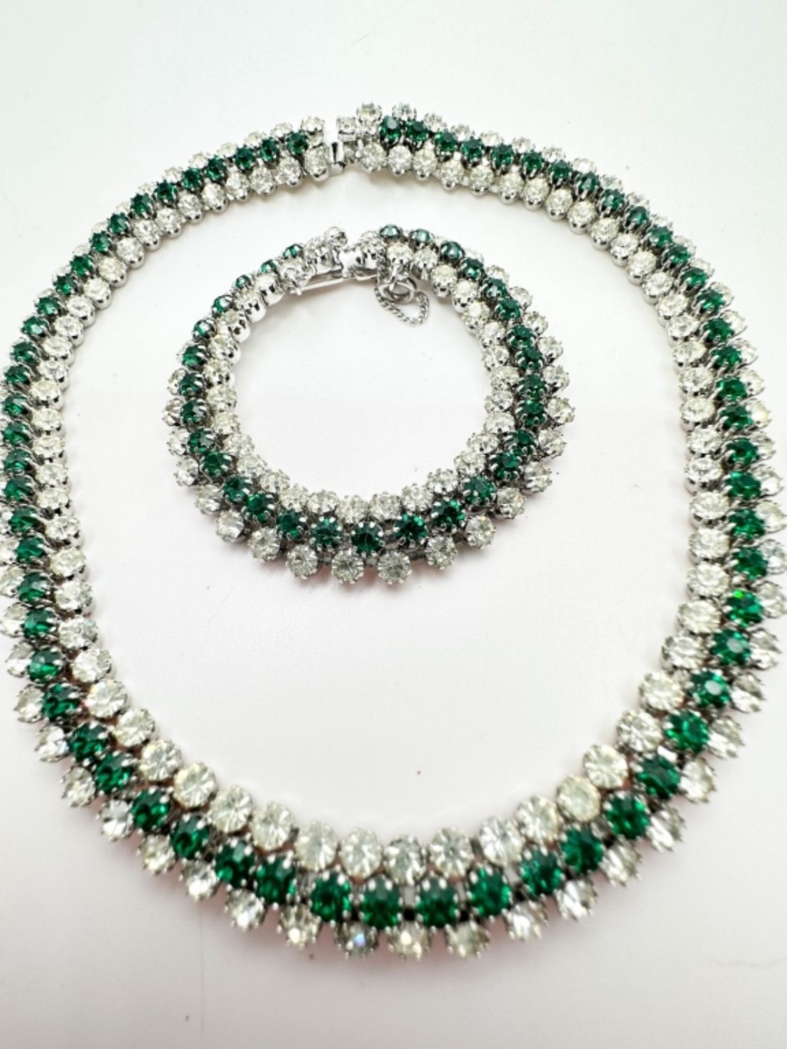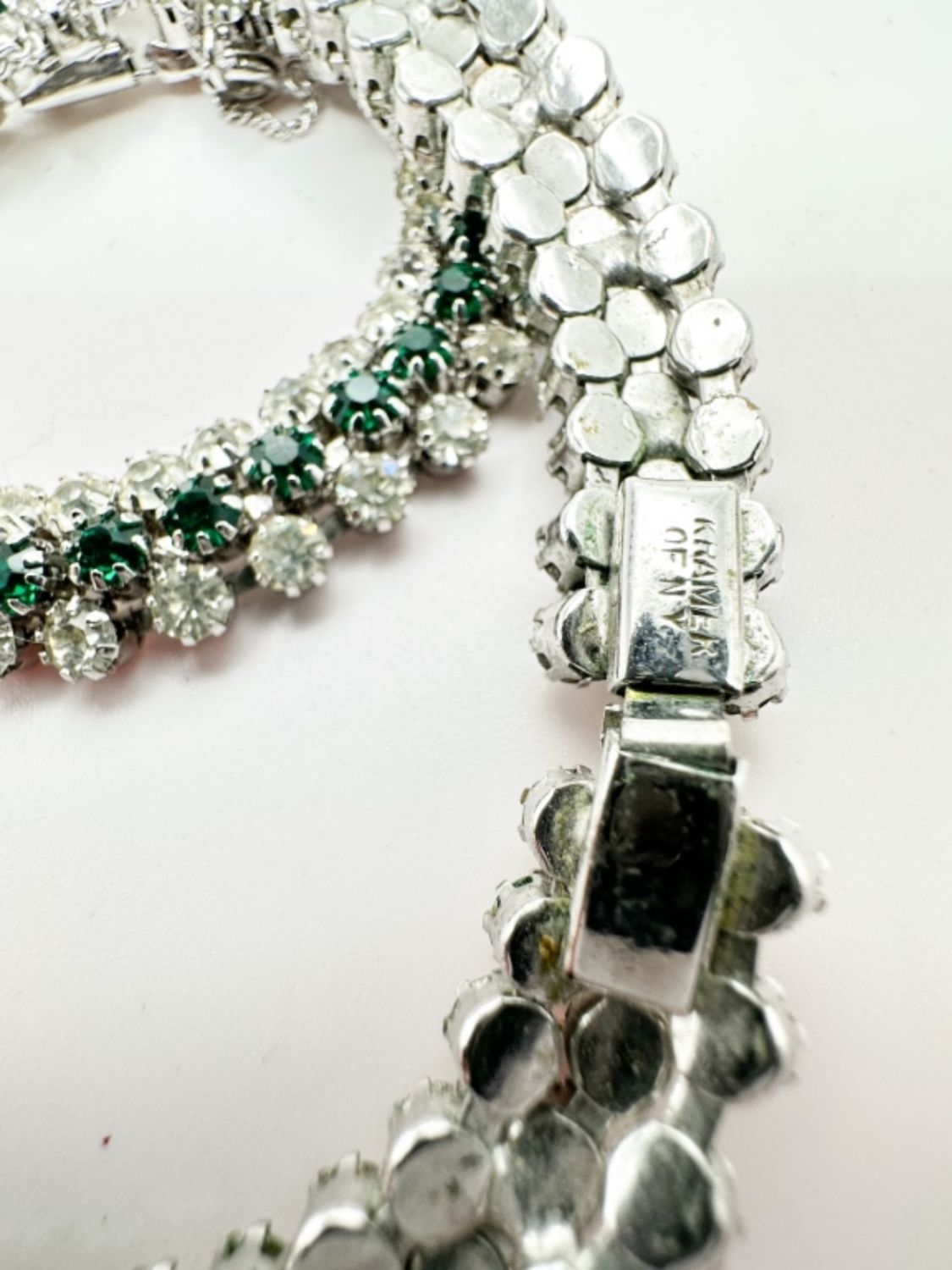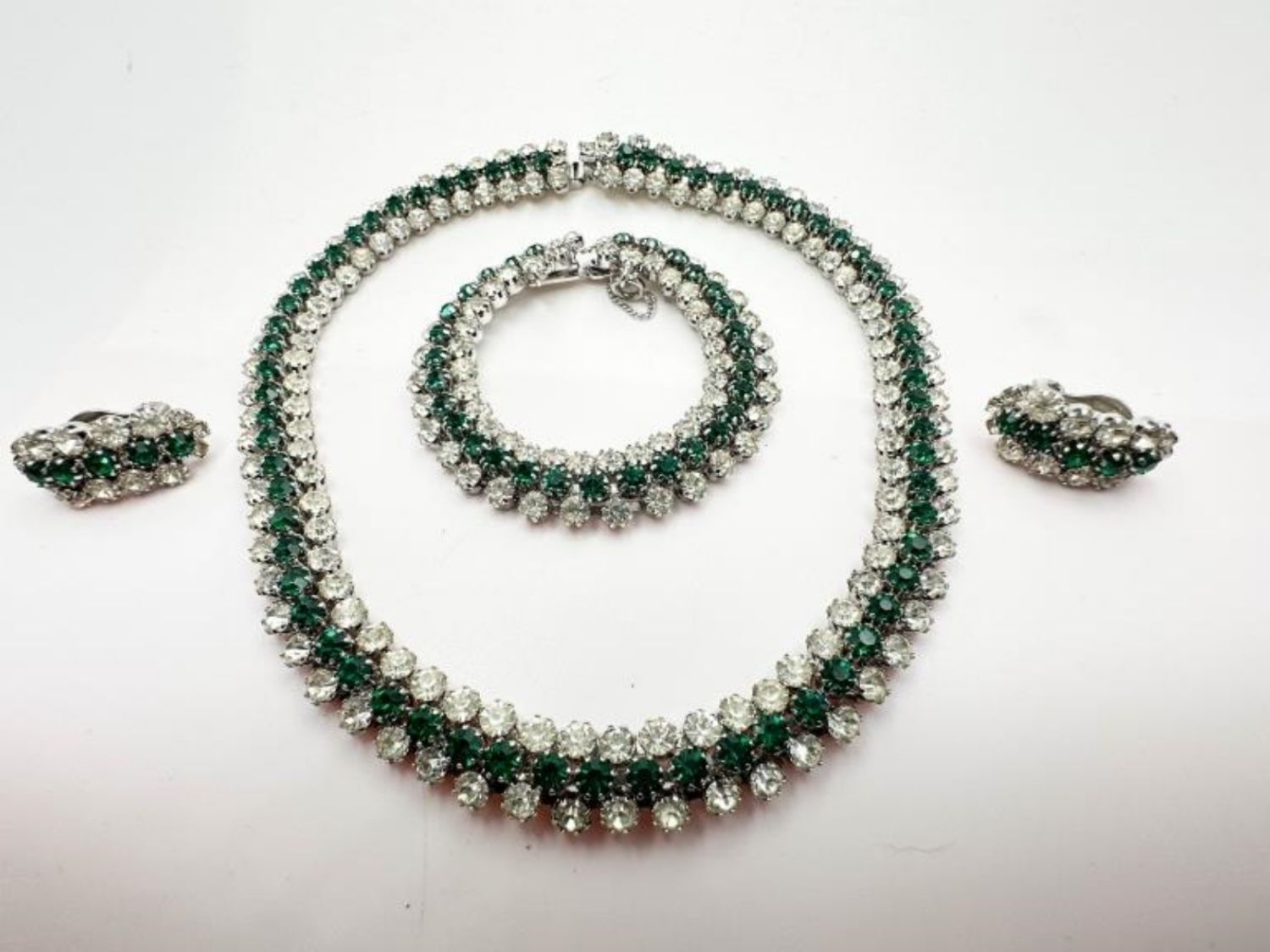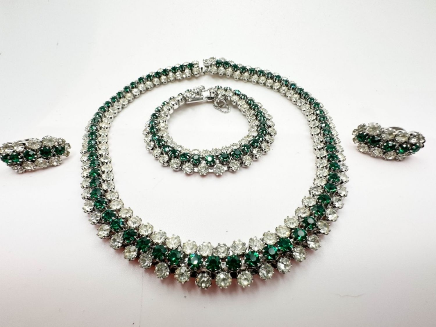 KRAMER SIGNED GREEN AND CLEAR RHINESTONE SET WITH NECKLACE EARRINGS AND BRACELET, AMAZING SHINE