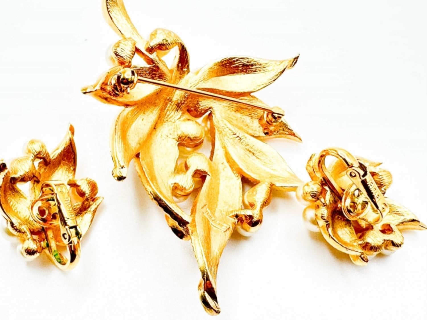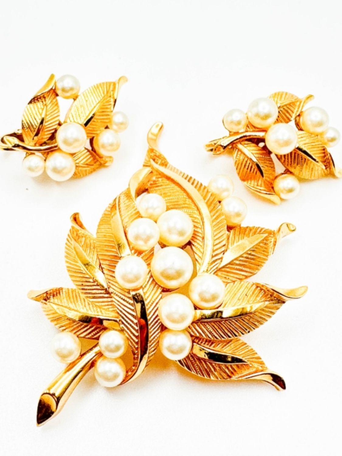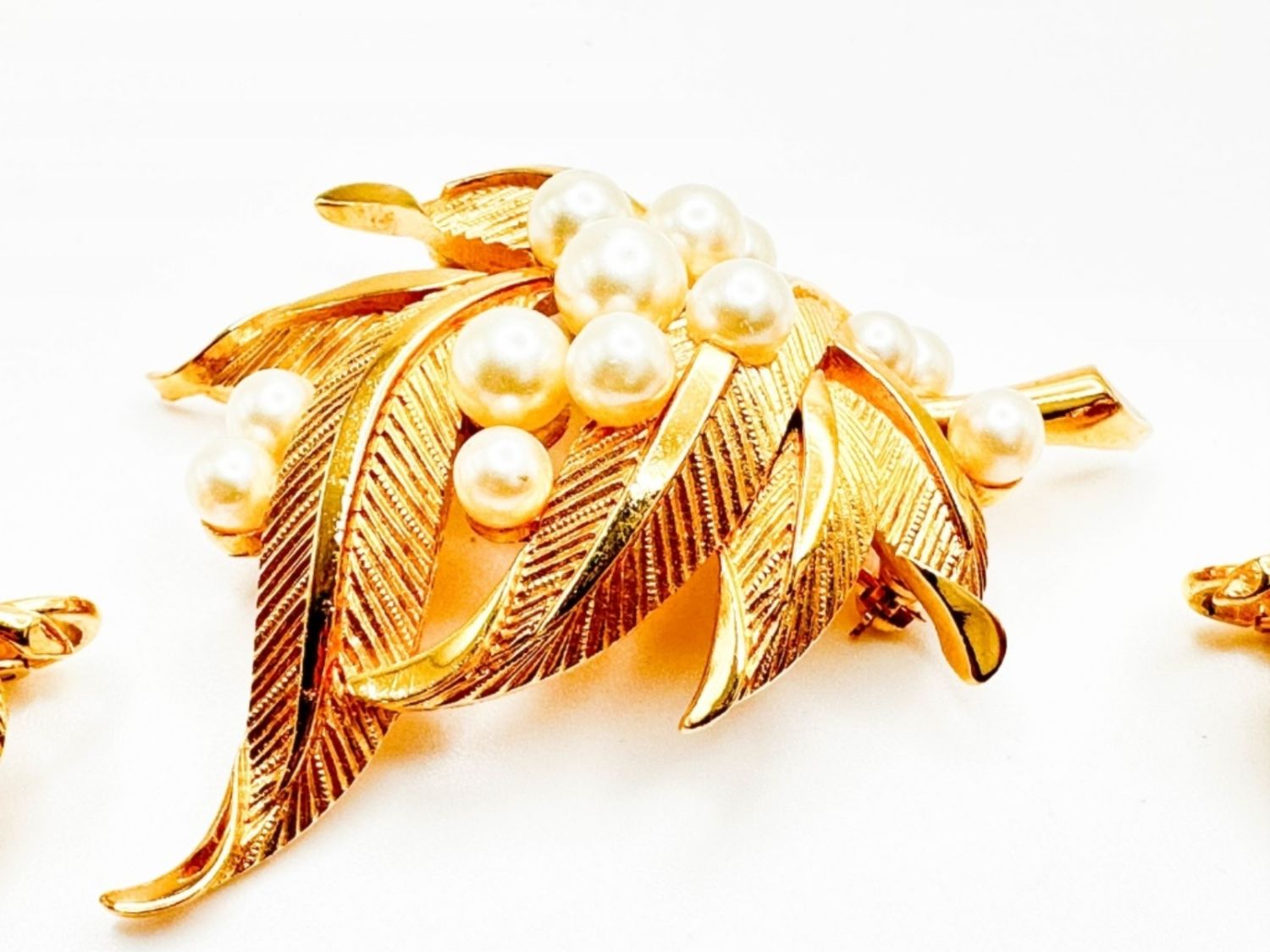 TRIFARI CROWN VINTAGE BROOCH SET W EARRINGS WITH PEARL LIKE AND GOLD TONE