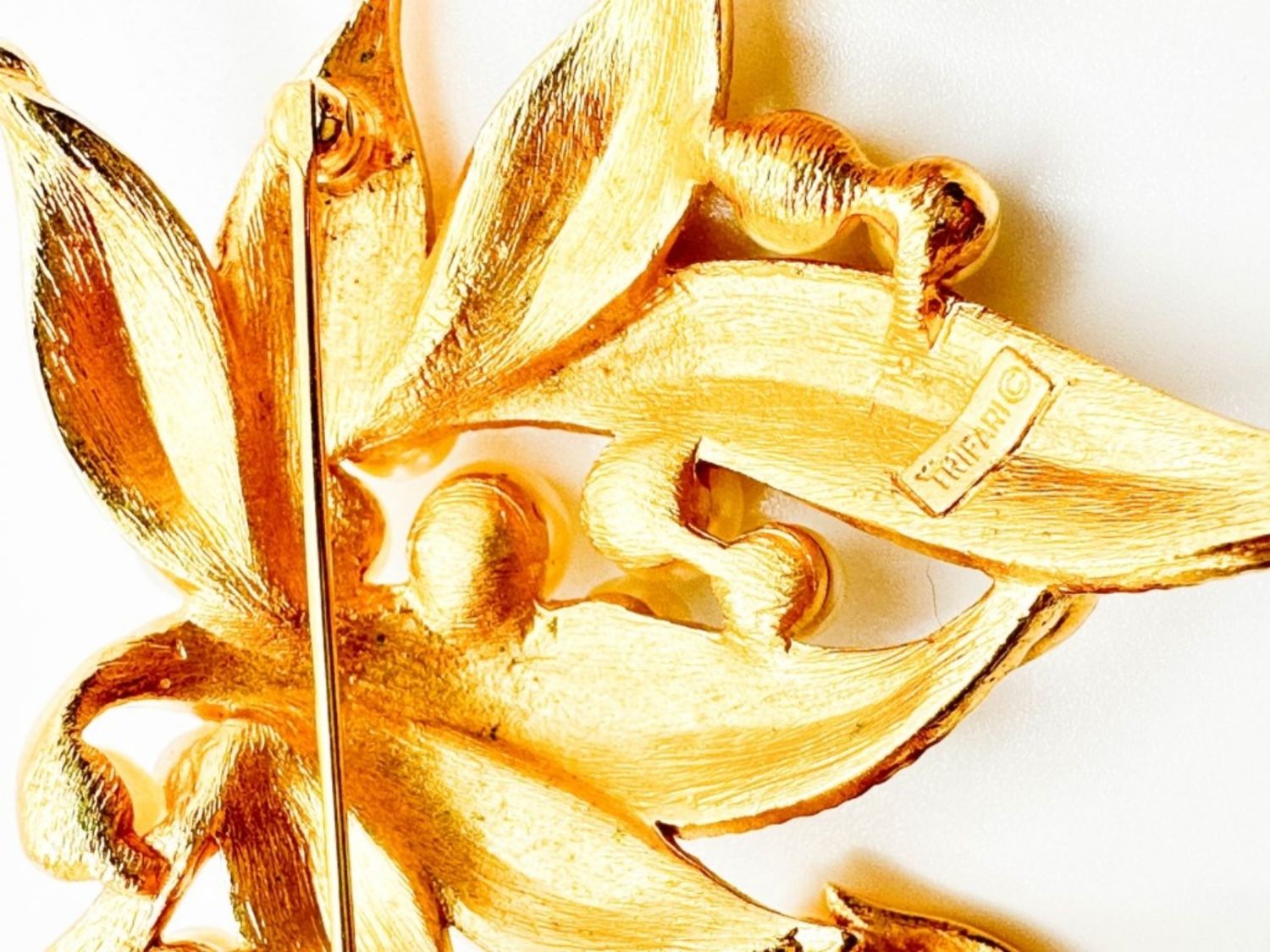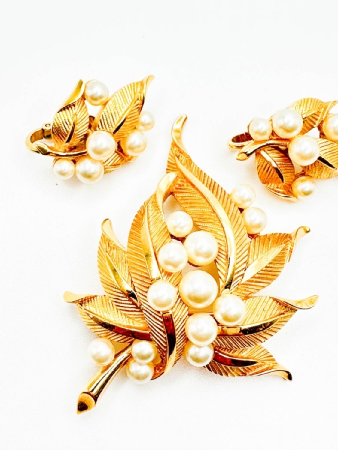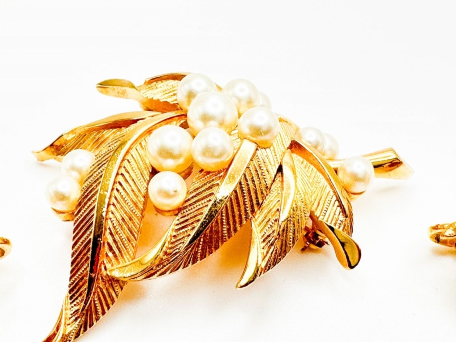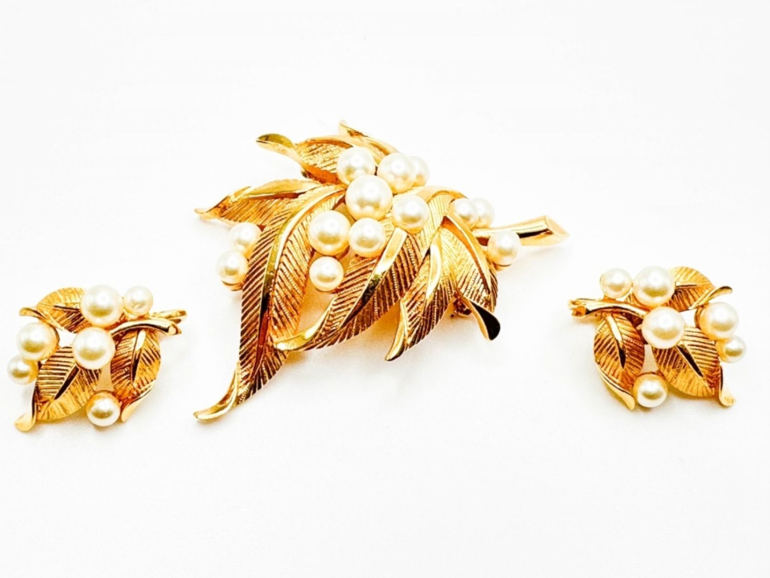 TRIFARI CROWN VINTAGE BROOCH SET W EARRINGS WITH PEARL LIKE AND GOLD TONE