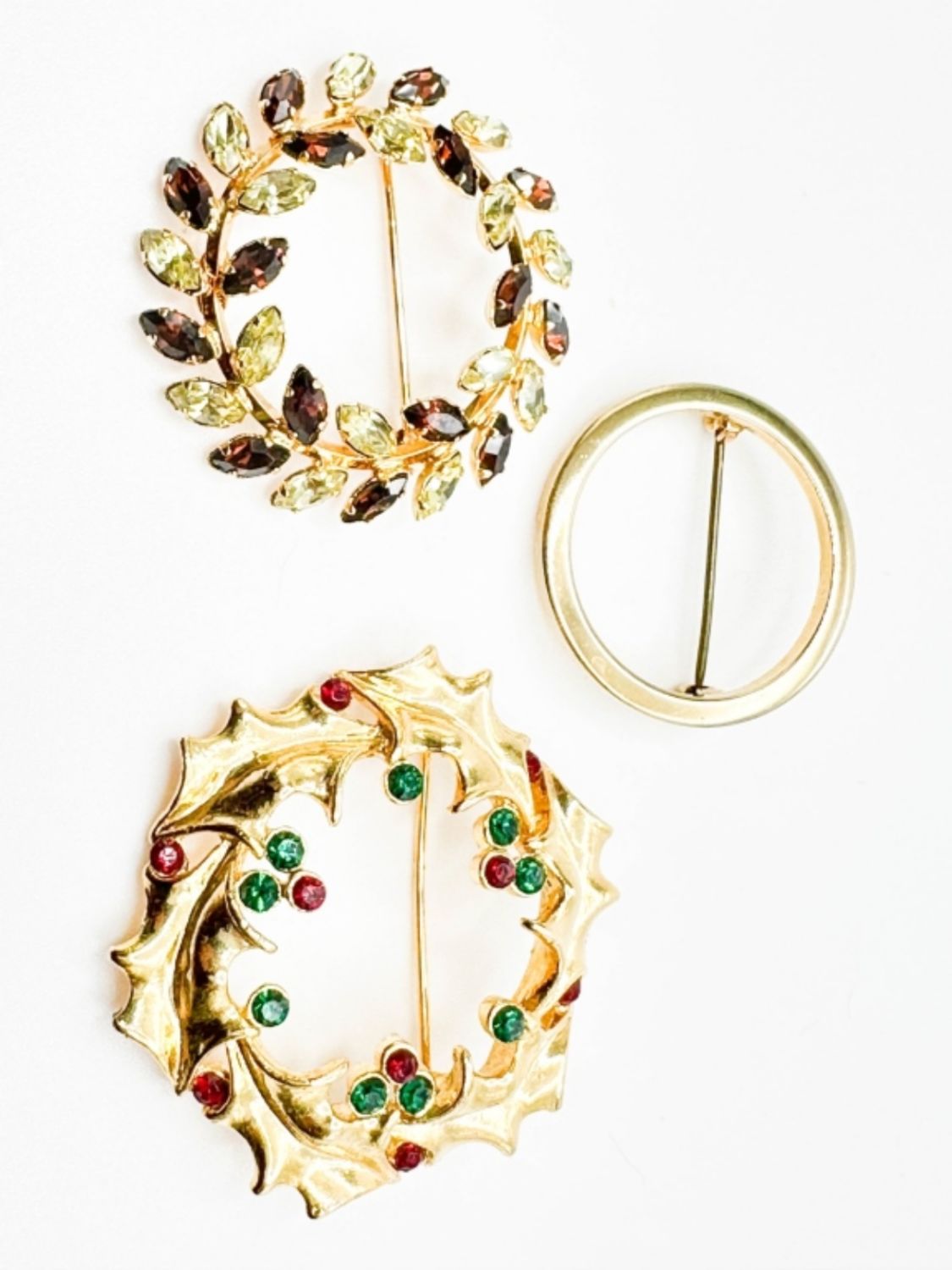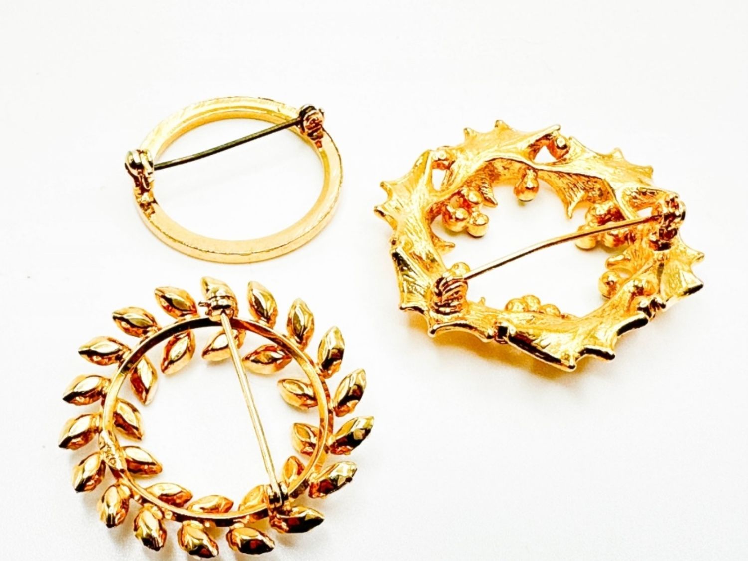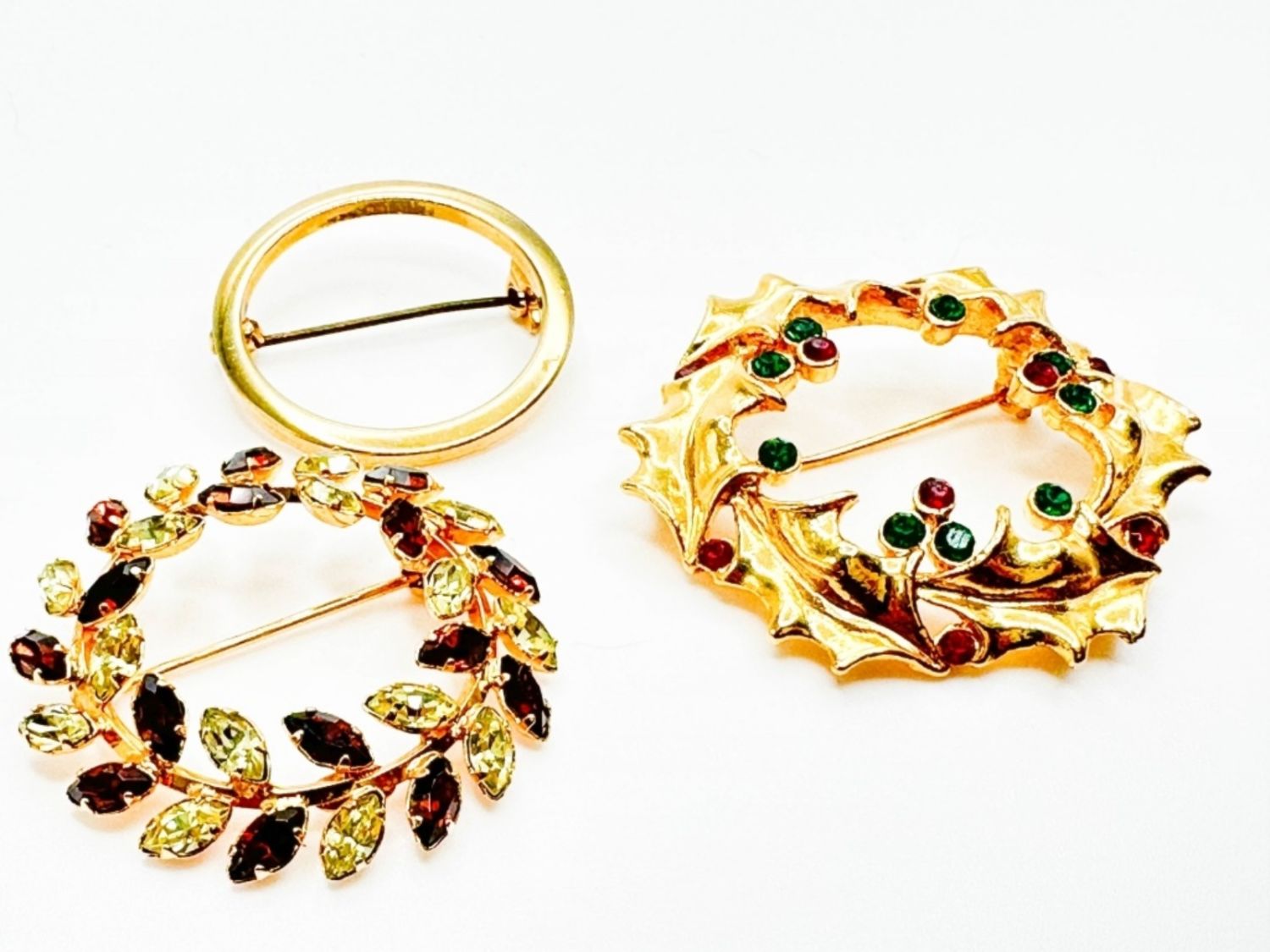 3 BEAUTIFUL CIRCLE BROOCHES ,TWO WITH COLOR STONES
