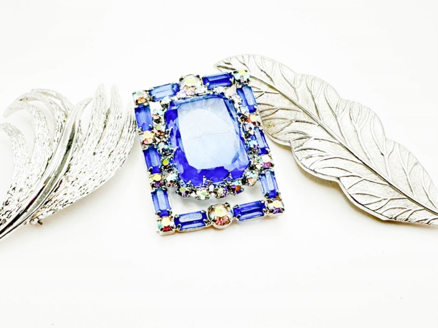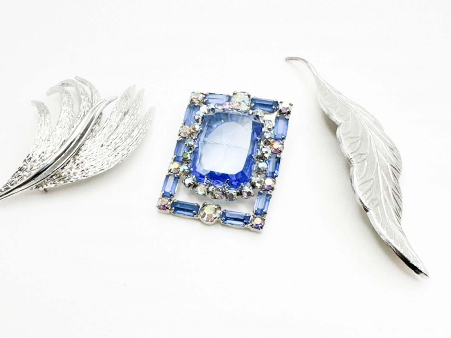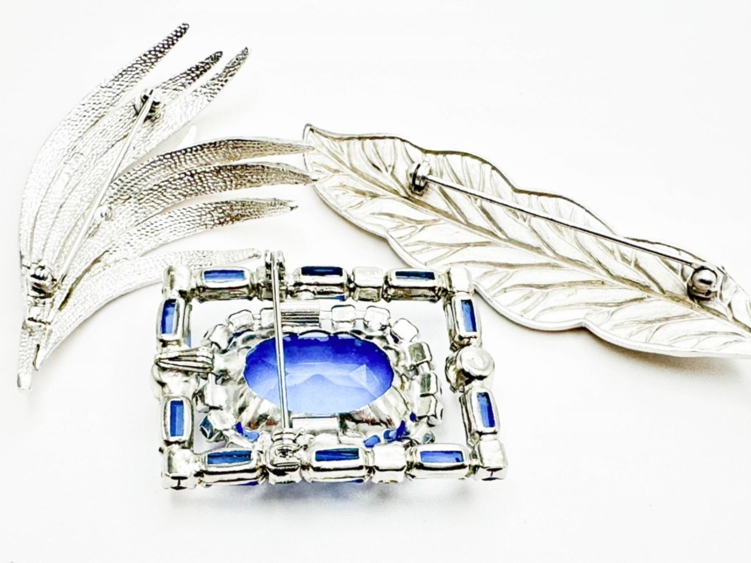 BLUE SSTONE BROOCH AND 2 LEAF BROOCHES