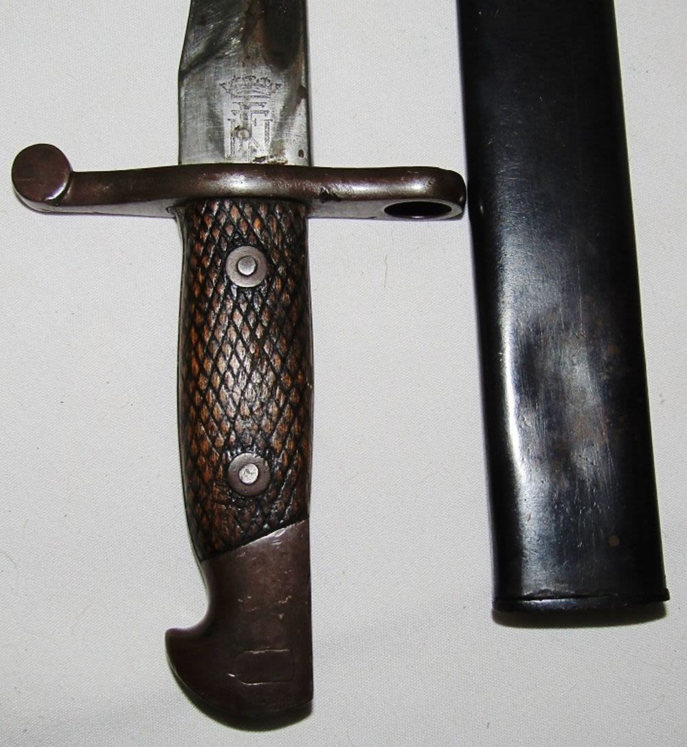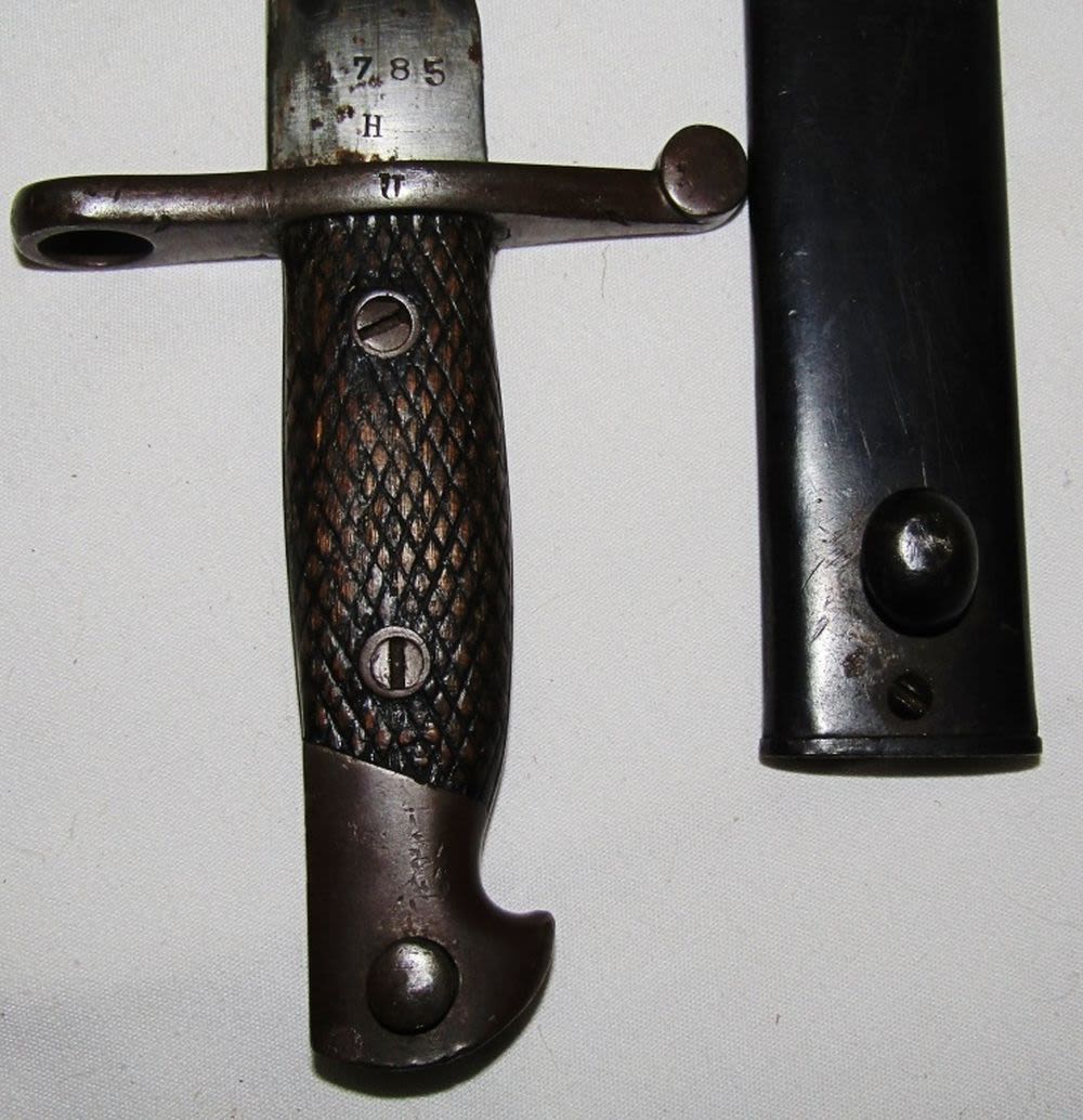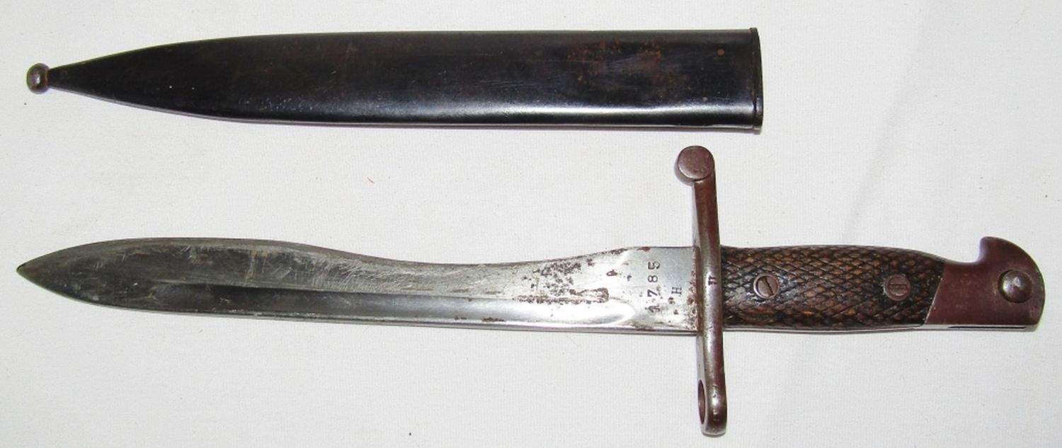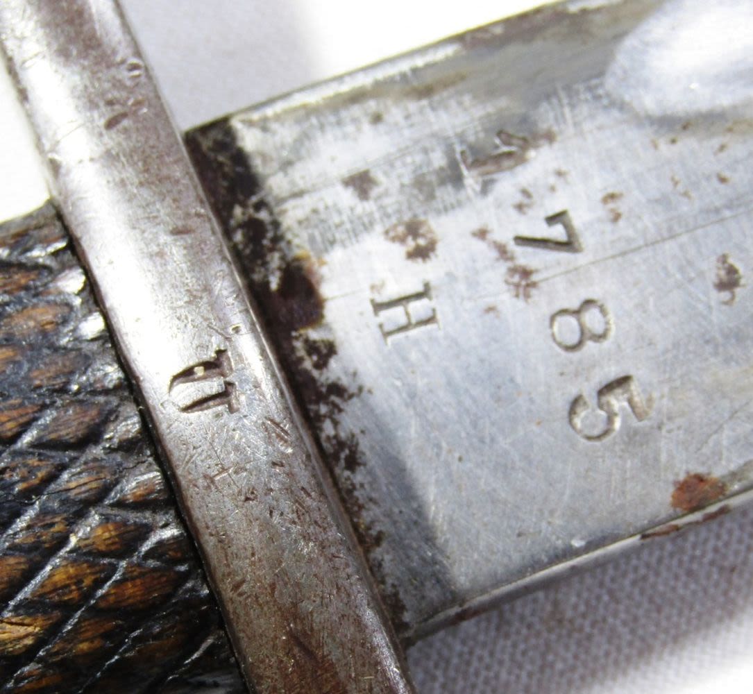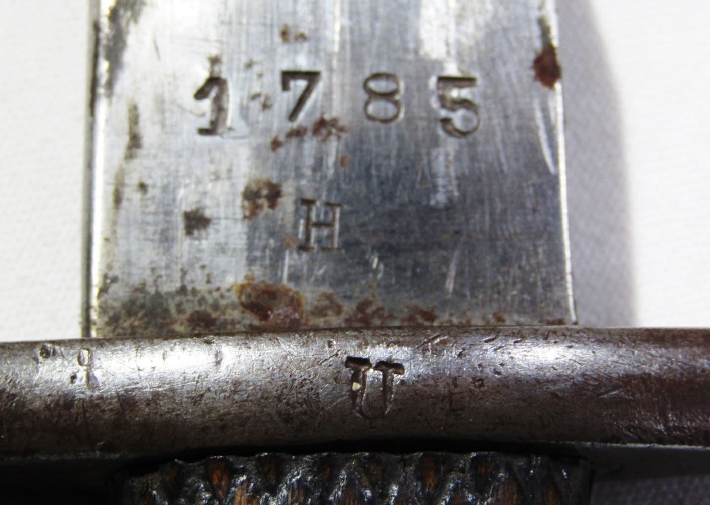 With Scabbard! Blade is marked 1785 H; Blade Length 9 3/4″ – Overall Length 14 5/8″.