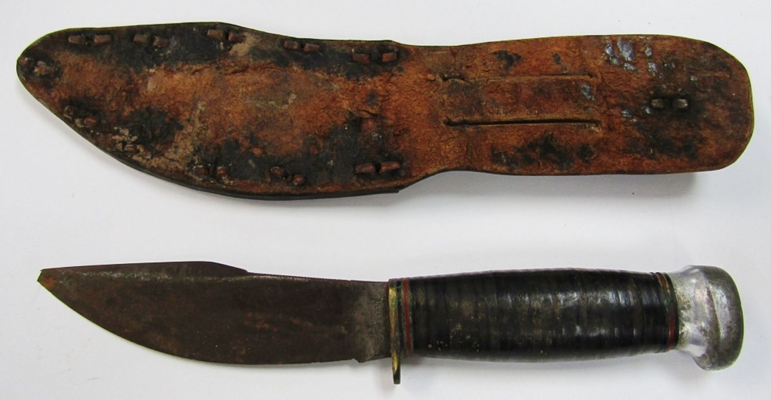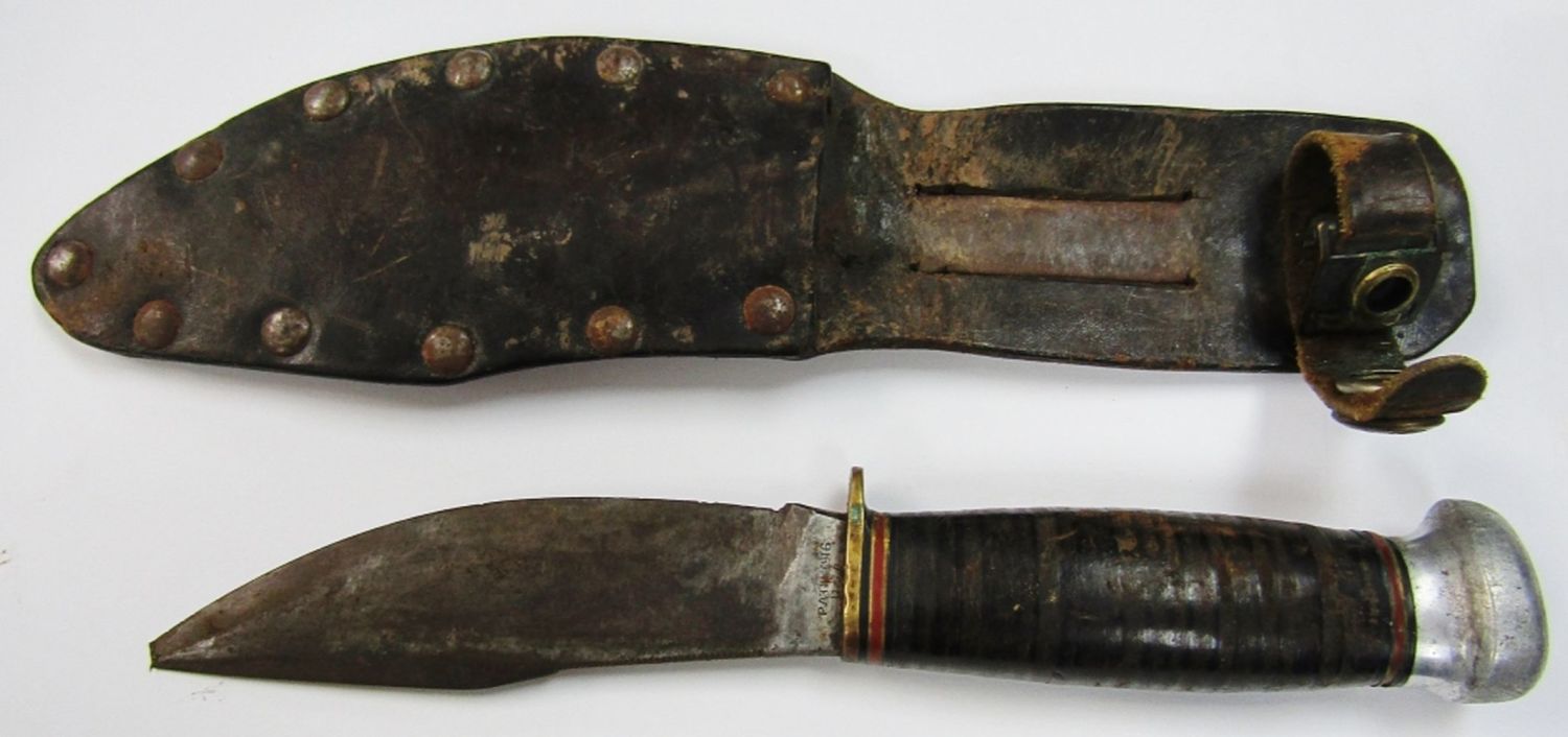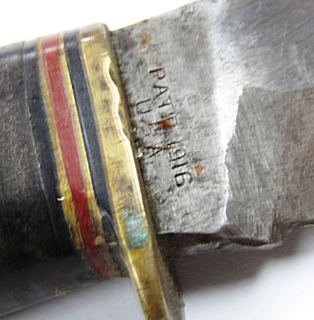 Pat’d 1916 WWII Handmade Sheath! Blade Legth 4 1/4″ – Overall Length 8 1/4″; Used Condition, Small Chip on Tip of Blade!