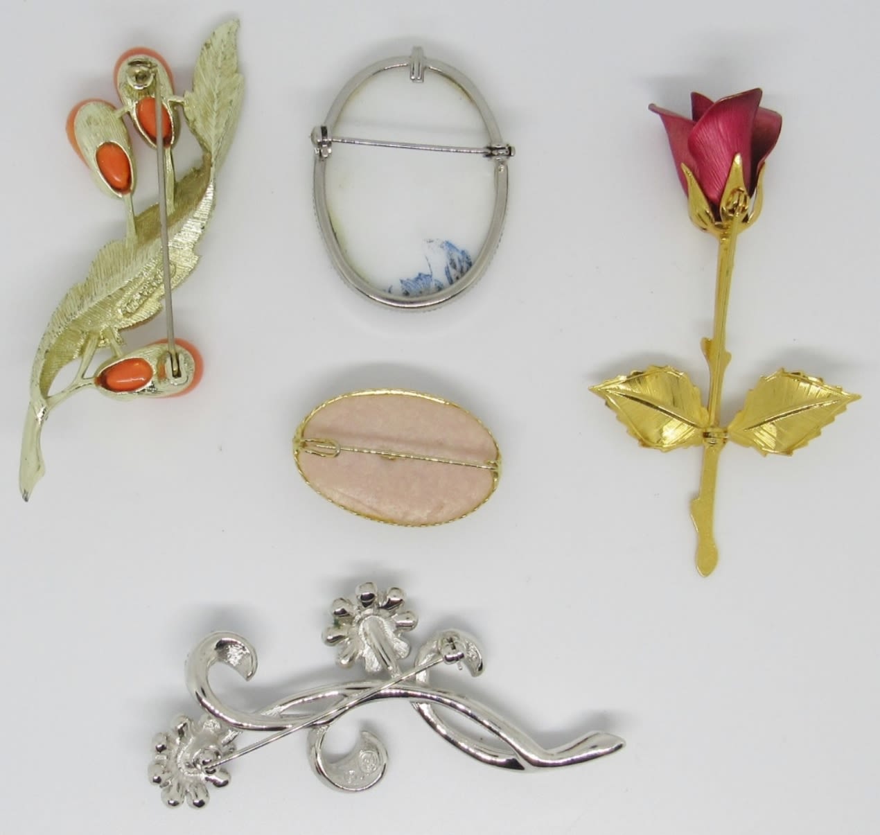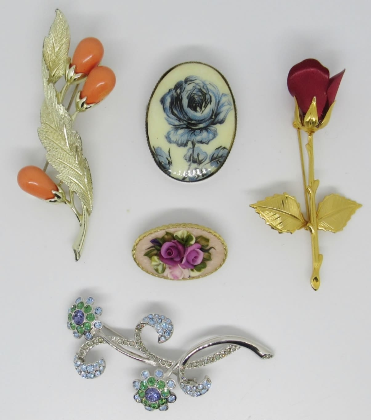 with ORANGE/PEACH ACCENTS, (2) OVAL FLORAL PINS, (1) ROSE PIN