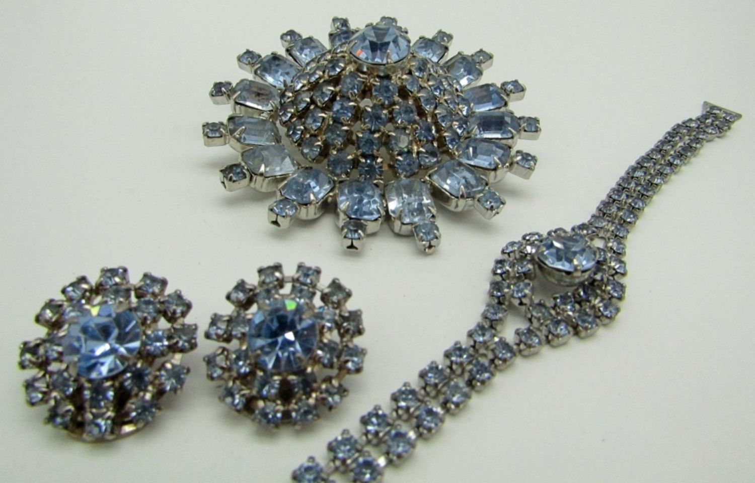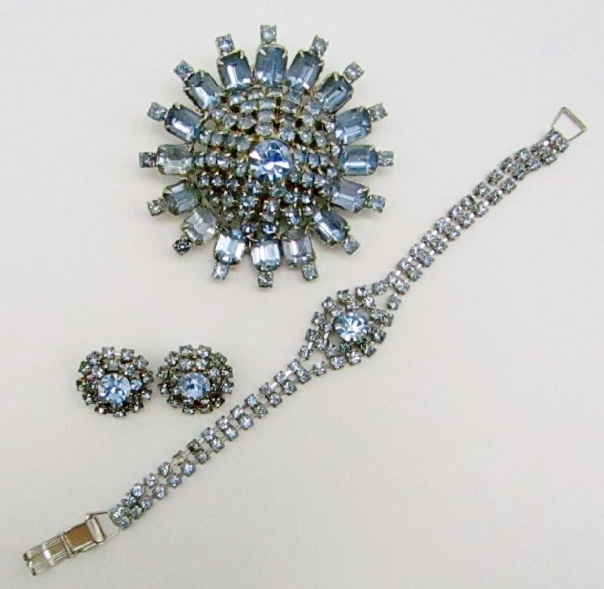 LARGE 3-D BROOCH, BRACELET 7″ has (1) weak spot that’s unattached, CLIP-ON EARRINGS – NO MISSING STONES ( VERY NICE CONDITION)