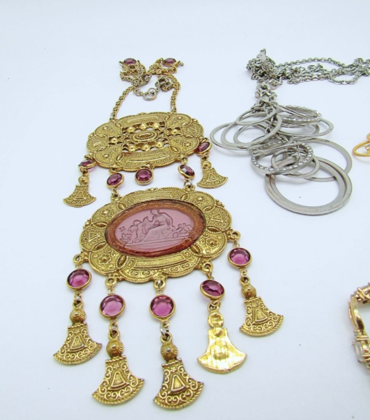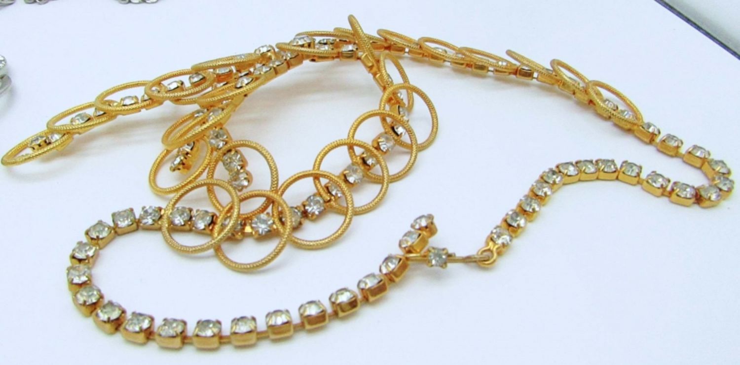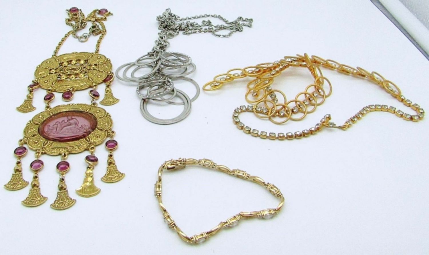2 GOLD TONED NECKLACES, GOLD TONED BRACELET AND SILVER NECKLACE