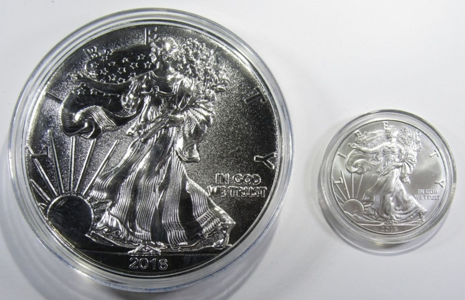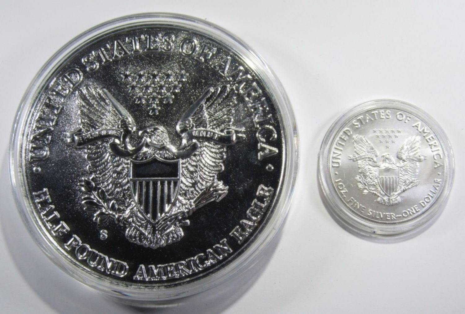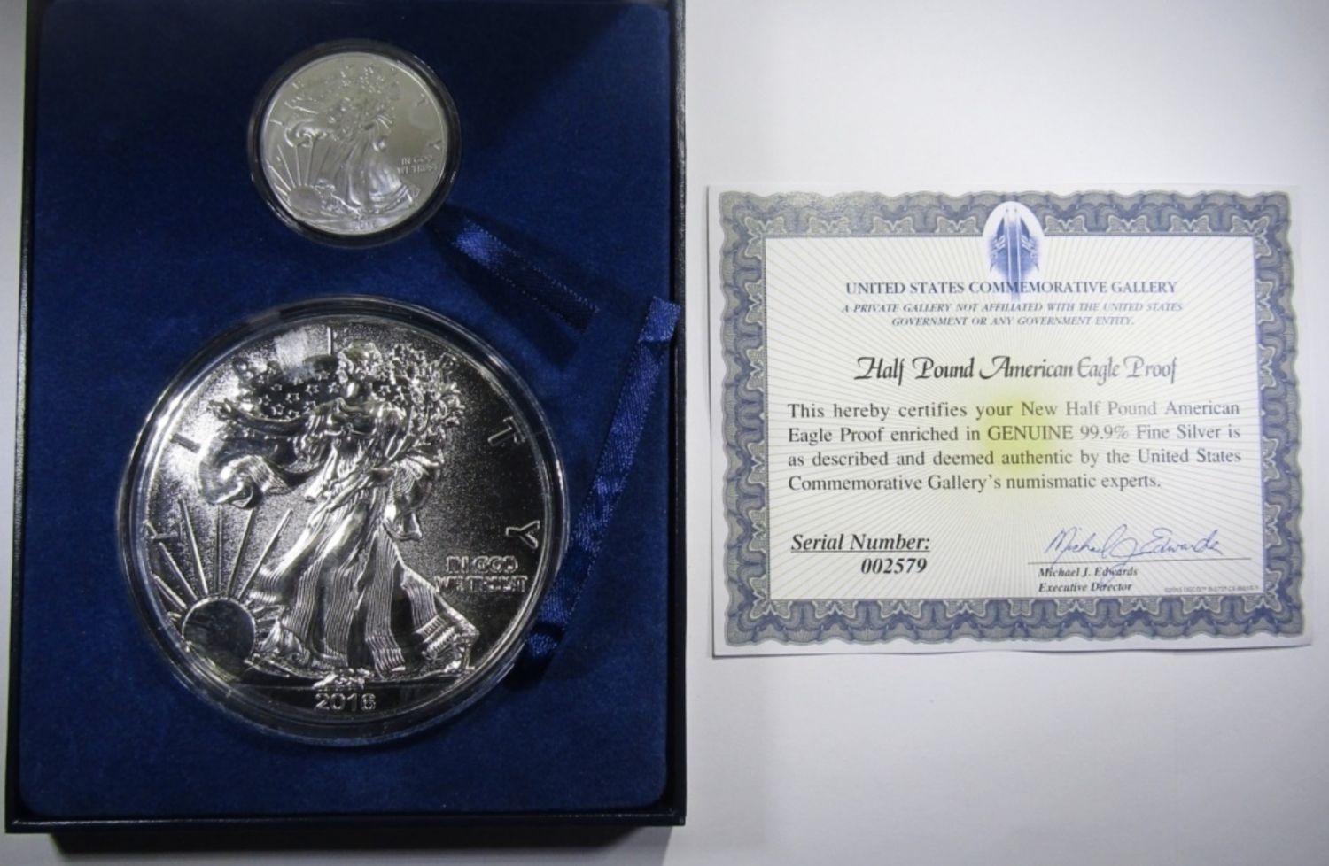 2016 BU 1oz SILVER EAGLE WITH SILVER-ENRICHED HALF-POUND REPLICA OF 2016-S PROOF SILVER EAGLE, IN DISPLAY BOX WITH COA. UNITED STATES COMMEMORATIVE GALLERY.