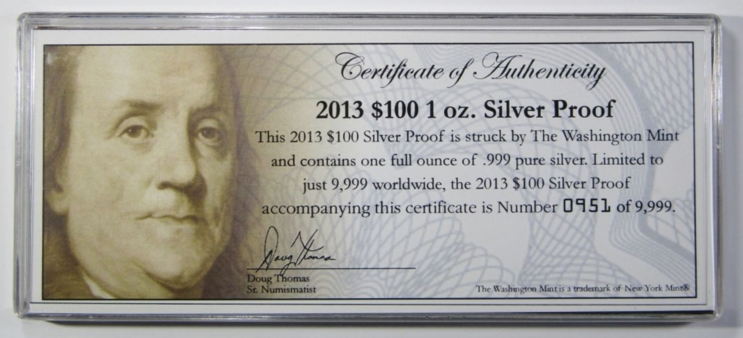 IN PLASTIC HOLDER, WITH COA. THE WASHINGTON MINT