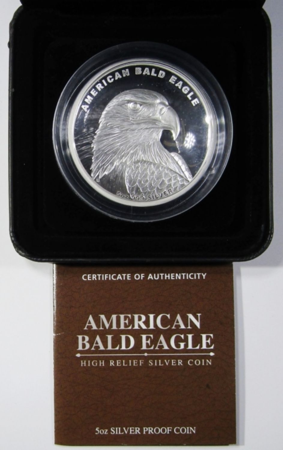 TUVALU $5 PROOF HIGH RELIEF COIN. 5oz .999 SILVER IN DISPLAY CASE WITH COA.