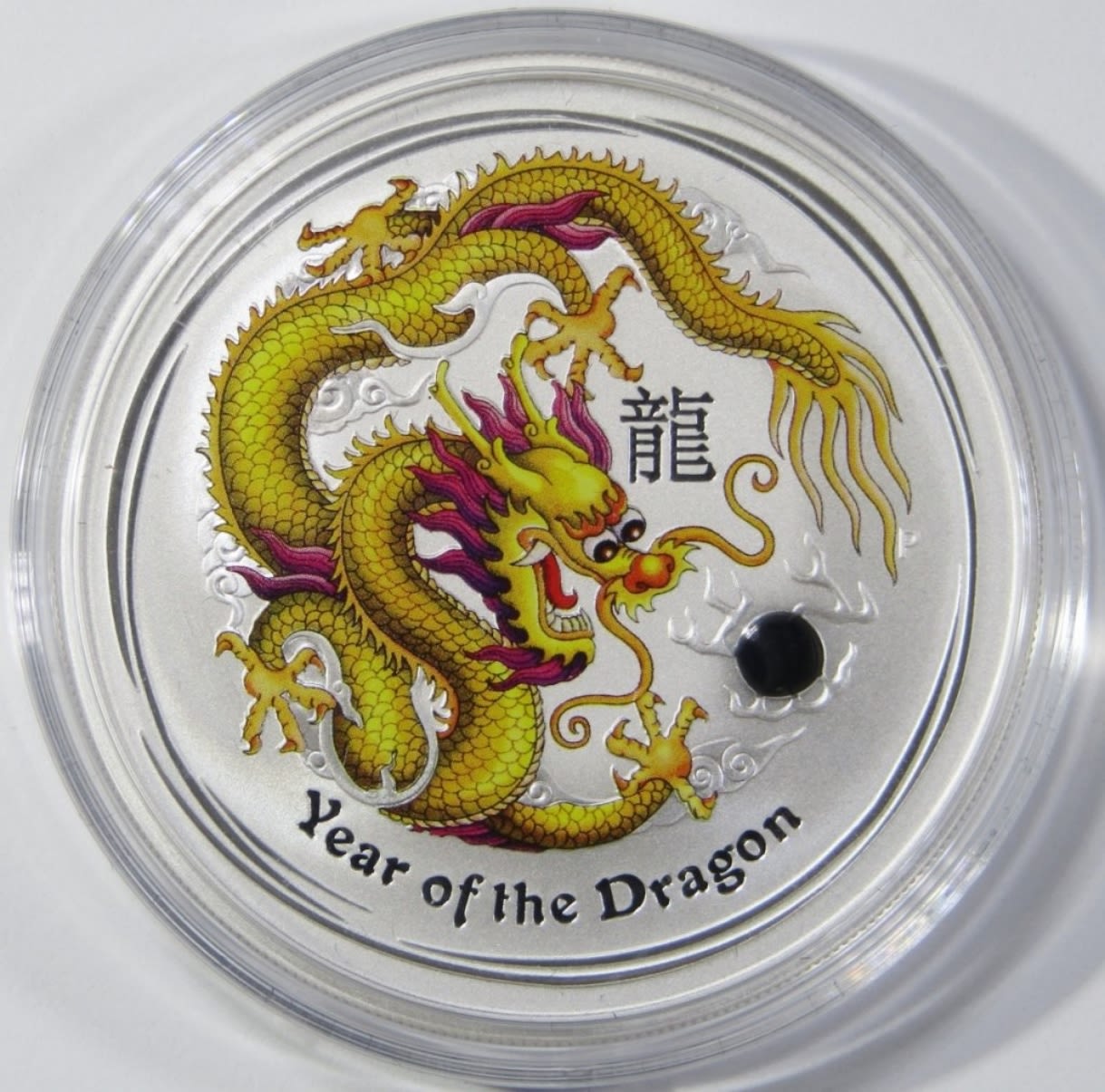 COLORIZED 1oz .999 SILVER YELLOW DRAGON. AUSTRALIAN LUNAR SERIES II. THE PERTH MINT ANDA MELBOURNE COIN SHOW SPECIAL. IN ORIGINAL CASE WITH COA. MISSING OUTER BOX