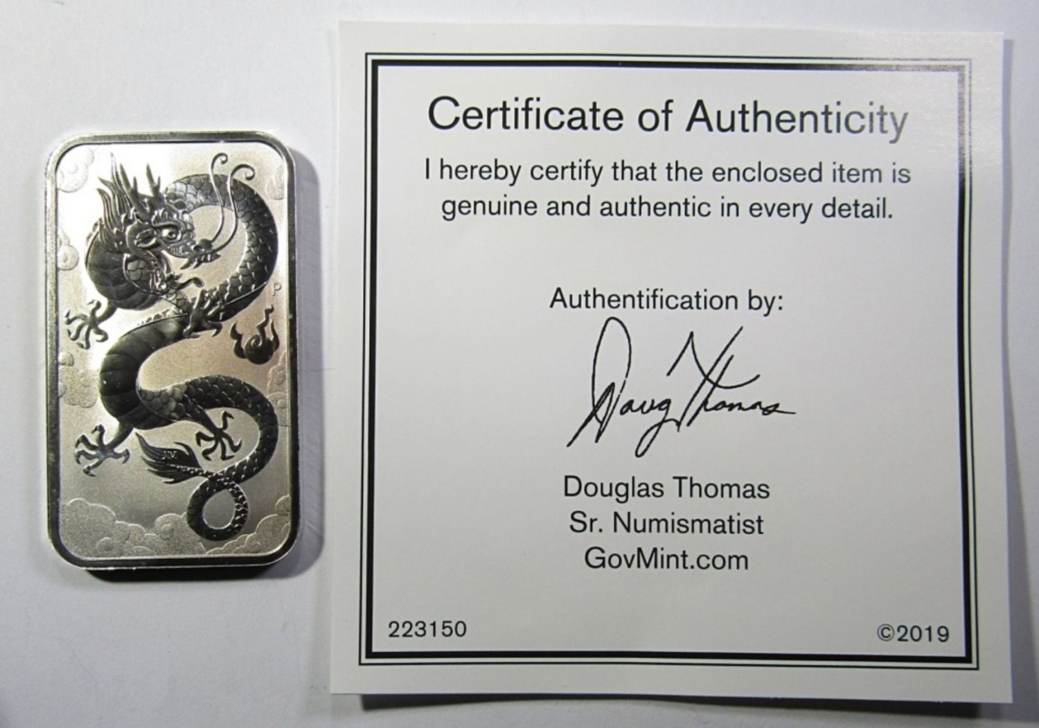 1oz .999 SILVER BAR. WITH GovMint COA