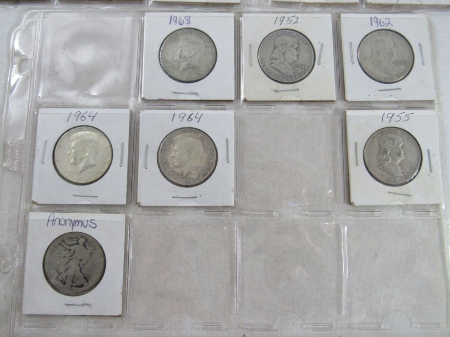 (12) WALKING LIBERTY, (12) FRANKLIN HALVES, (11) 1964 KENNEDY 50c, (12) 40% SILVER KENNEDY HALF DOLLARS – NICE COLLECTION – ALL in 2×2 FILPS
