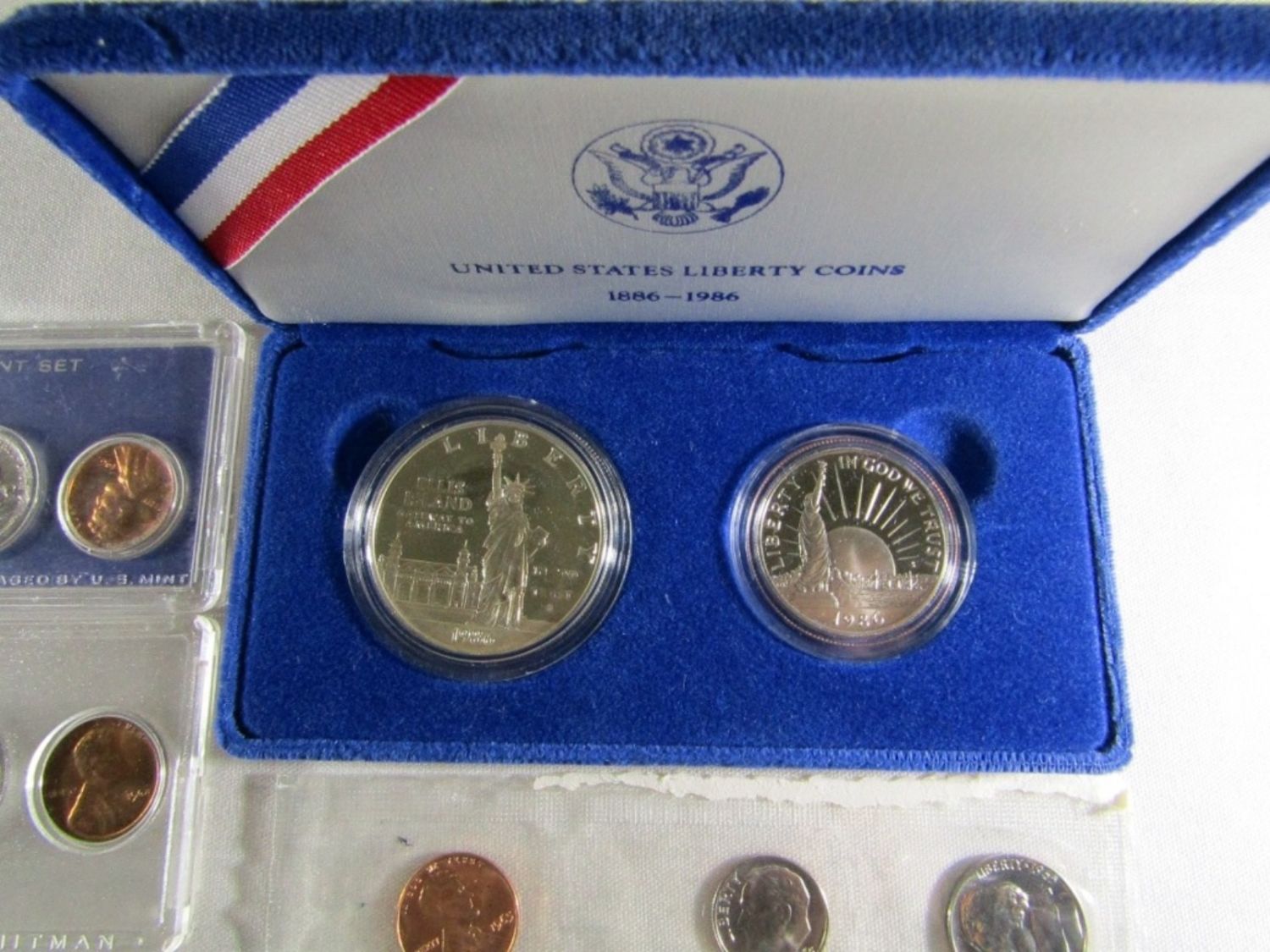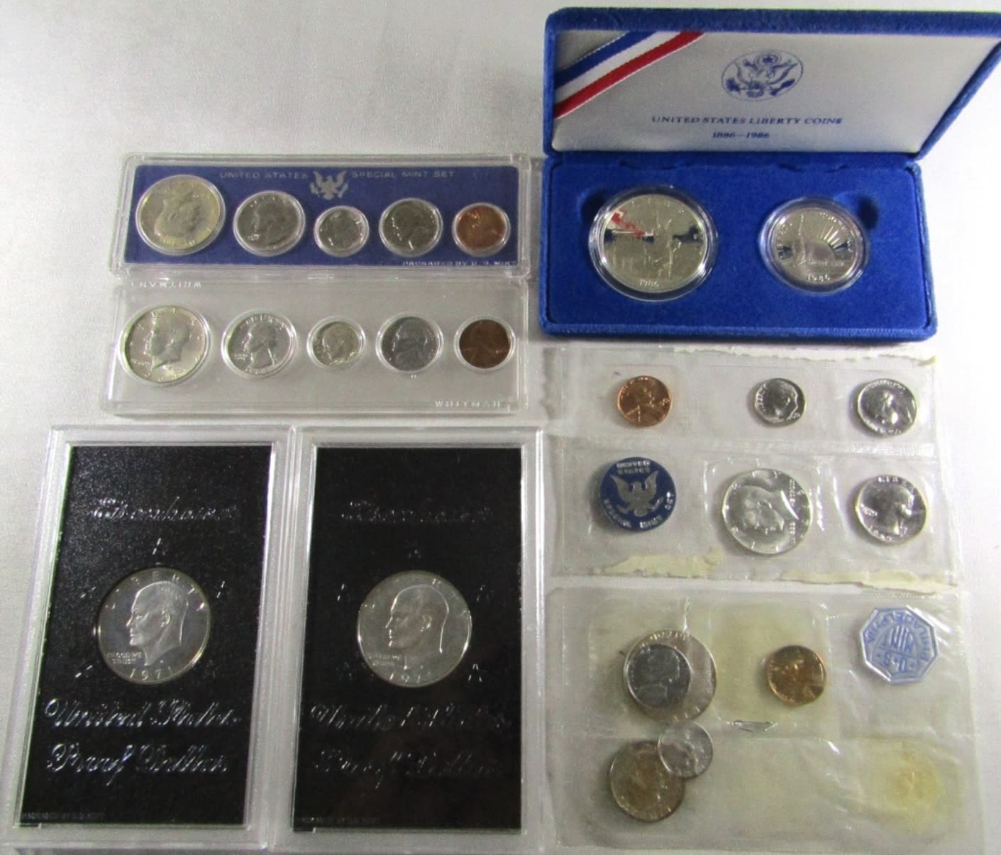 ALL ITEMS NOT IN ORIG PACKAGING OR MISSING OUTER PACKAGING, 2 BROWN IKES 1971, 1986 LIBERTY 2pc COMMEM SET, 1965 & 67 SMS SETS, 1961 PROOF SET AND 1964 MINT SET.