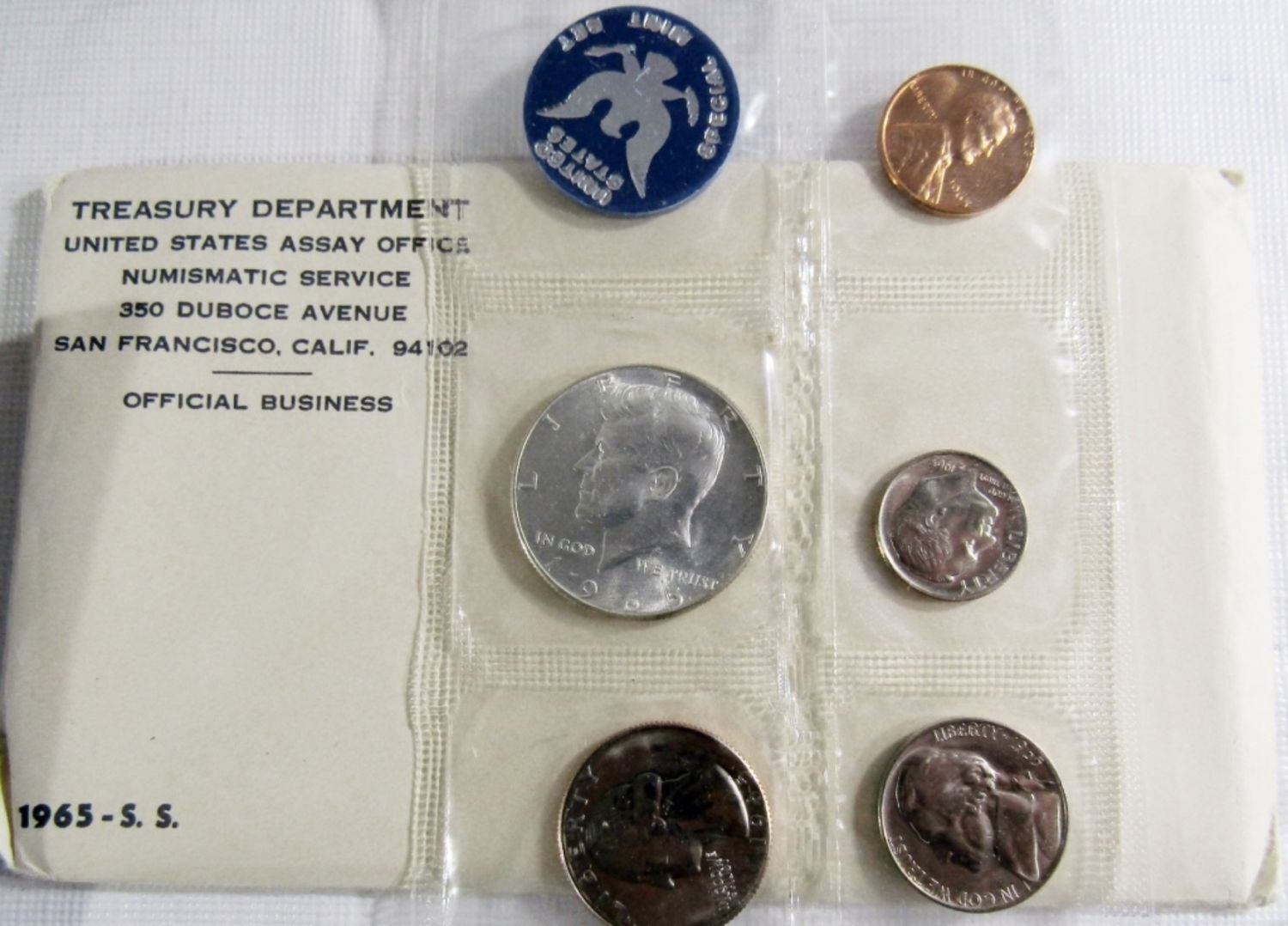 1965 SMS SET IN ORIG PACKAGING, 2003 PROOF SET NO BOX, 1984 MINT SET NO ENVELOPE, 2007 10 of 14 COIN SET, 1993 THOMAS JEFFERSON COMMEM SILVER DOLLAR IN BOX W/ COA, AND 225th ANNIV. ENHANCED UNC COIN SET.