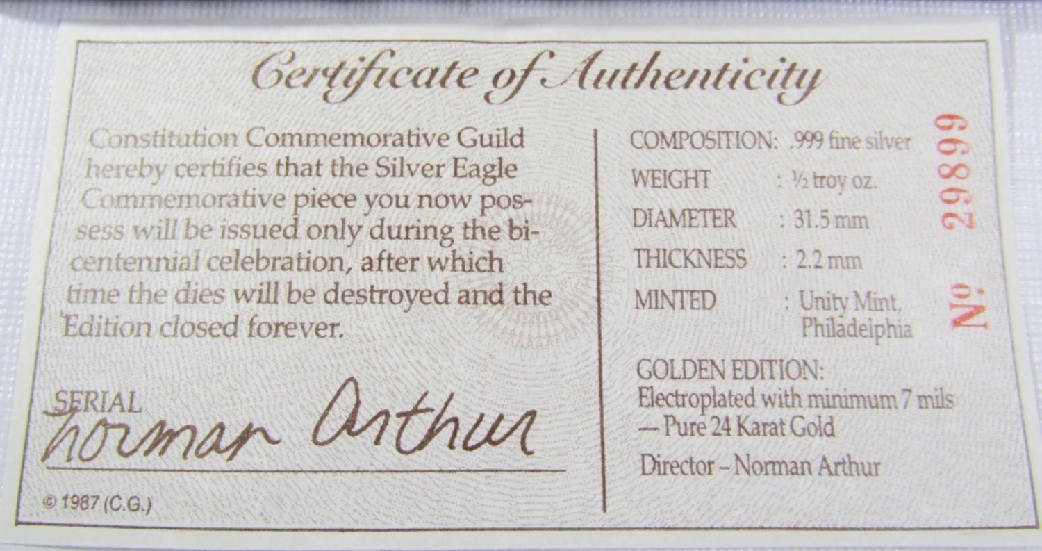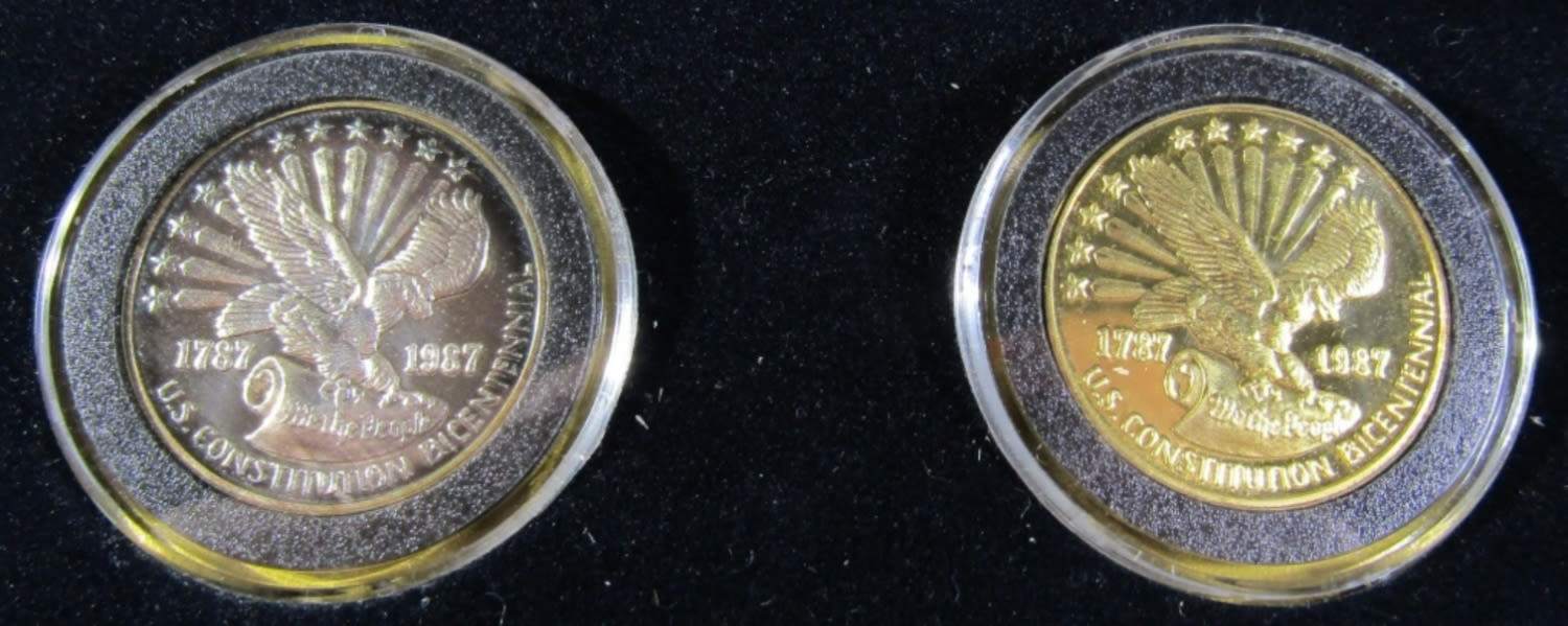 (2) 1/2 oz .999 SILVER CONSTITUTION BICENTENNIAL ROUNDS. ONE ELECTROPLATED WITH 24K GOLD. IN DISPLAY BOX WITH COA. UNITY MINT.