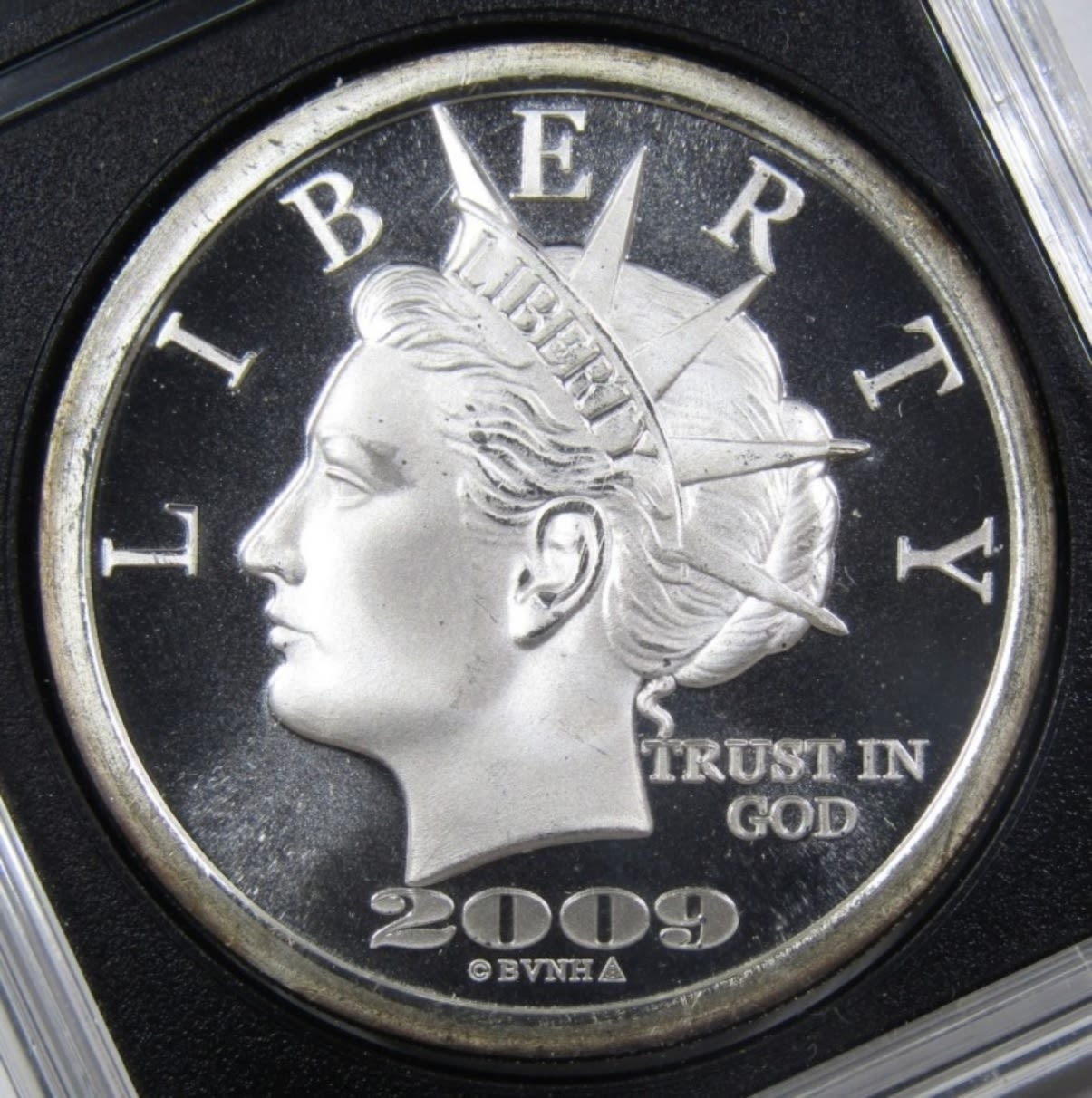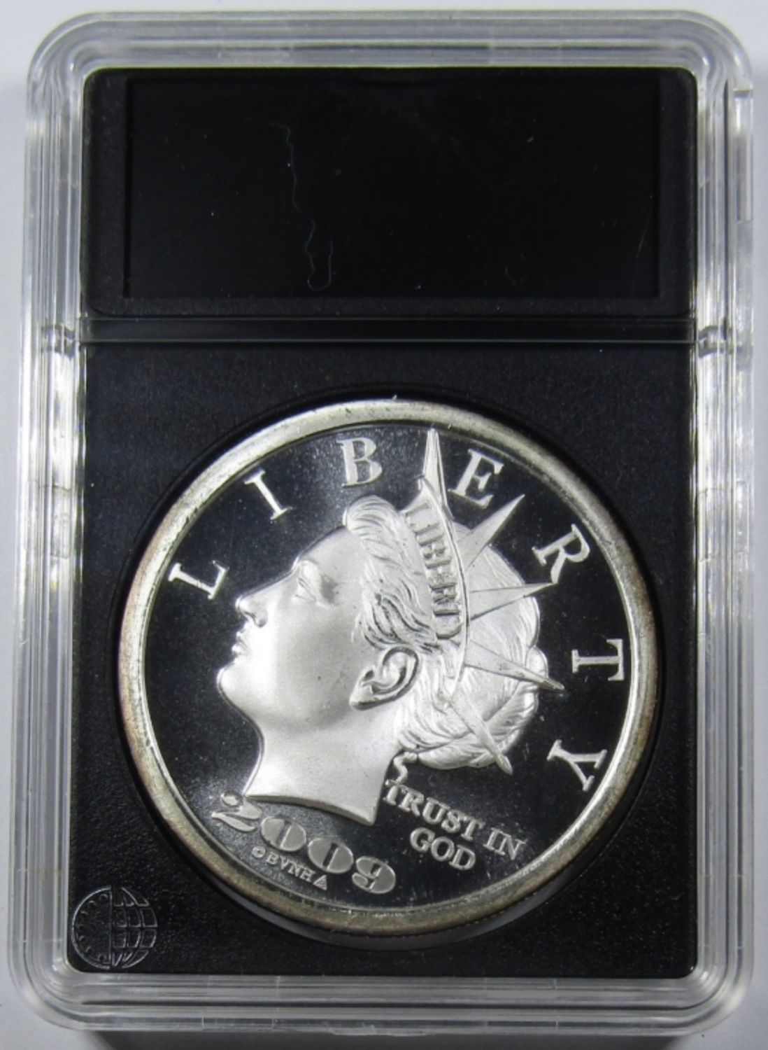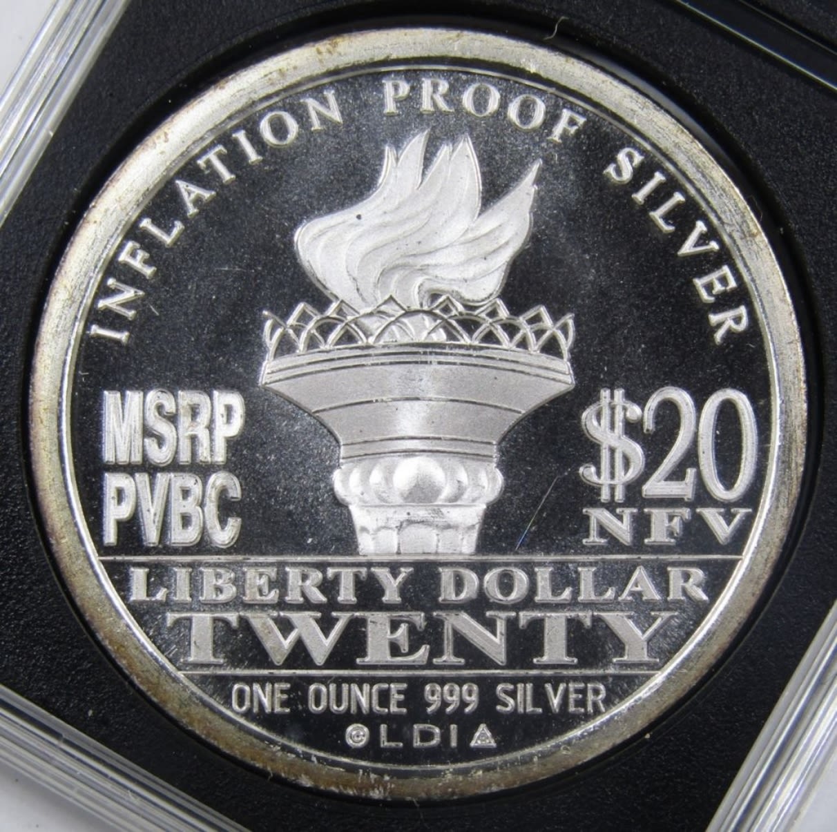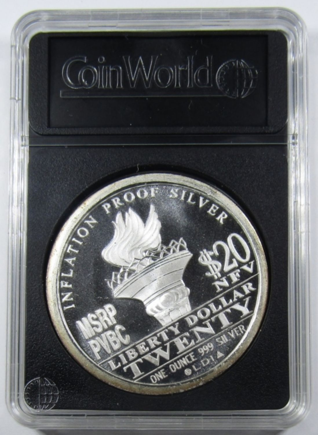 “$20 LIBERTY DOLLAR” SILVER ROUND IN PLASTIC SLAB.