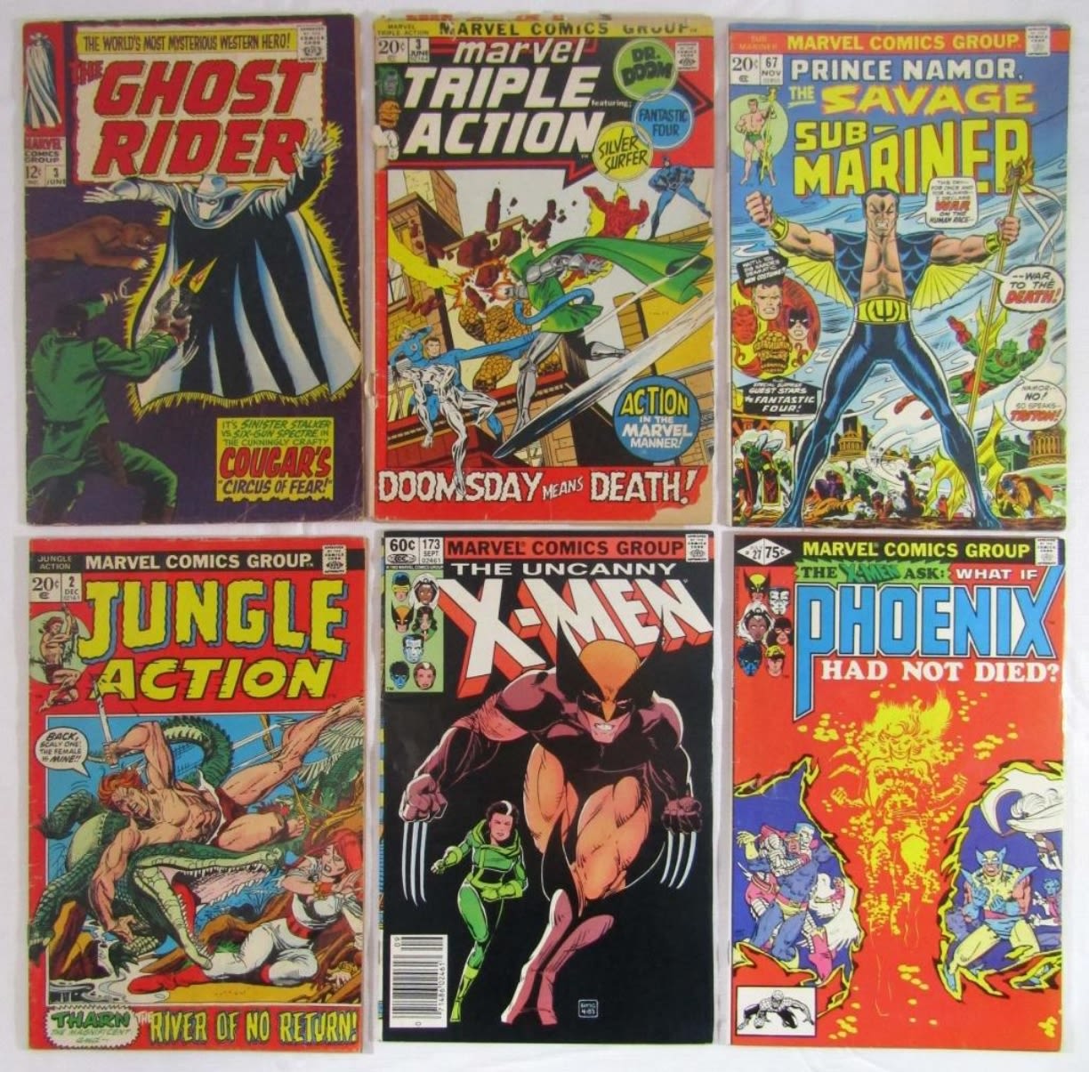 12c THE GHOST RIDER #3, 20c TRIPLE ACTION #3, THE SAVAGE SUB-MARINER #67, JUNGLE ACTION #2, THE UNCANNY X-MEN #173, PHOENIX #27 – GREAT MIX