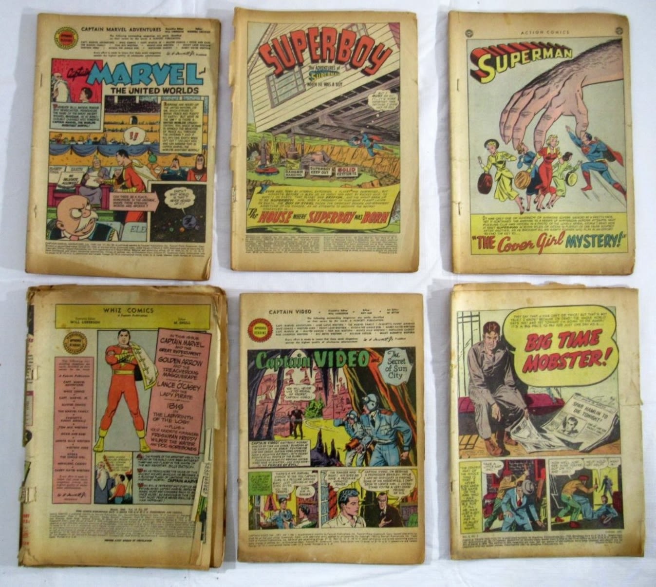 1949 CAPTAIN MARVEL, 1957 SUPERBOY, SUPERMNA, CAPTAIN VIDEO No1, BIG TIME MOBSTER, WHIZ COMICS & MORE – BRITTLE LOT – MISSING COVERS / PAGES