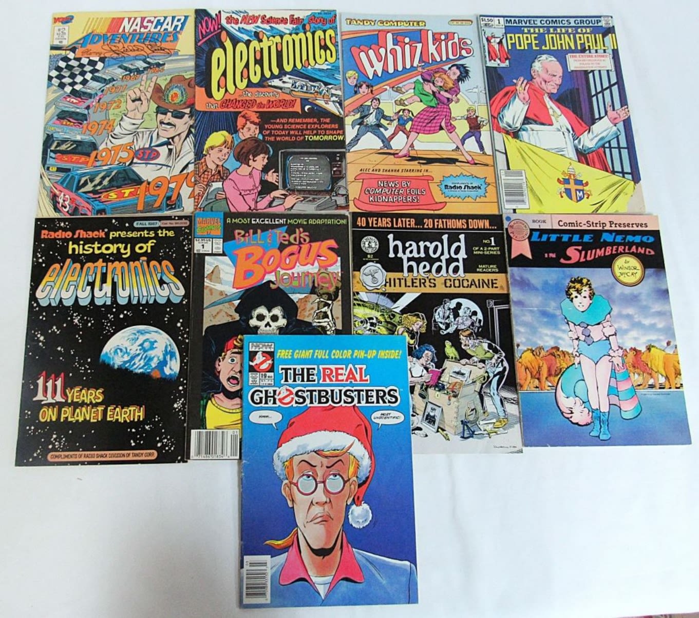 HAROLD HEED HITLER’S COCAINE, THE REAL GHOSTBUSTERS, POPE JOHN PAUL II #1, LITTLE NEMO IN SLUBERLAND #1, WHIZ KIDS, ELECRTRONICS , NASCAR & MORE
