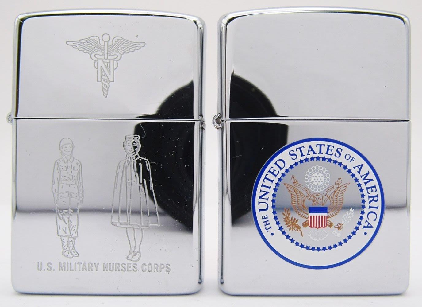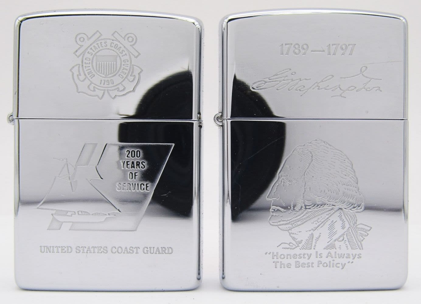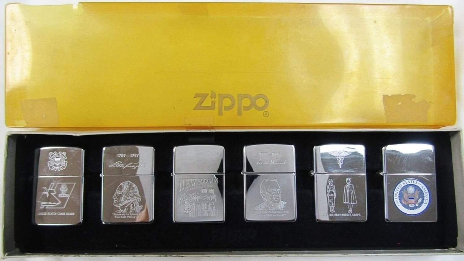 1994 COAST GUARD, 1994 MILITARY NURSES CORP, 1996 GEORGE WASHINGTON, 1996 ROOSEVELT, 2000 NEW YORK CITY & 2002 UNITED STATES of AMERICA in ZIPPO DISPLAY BOX