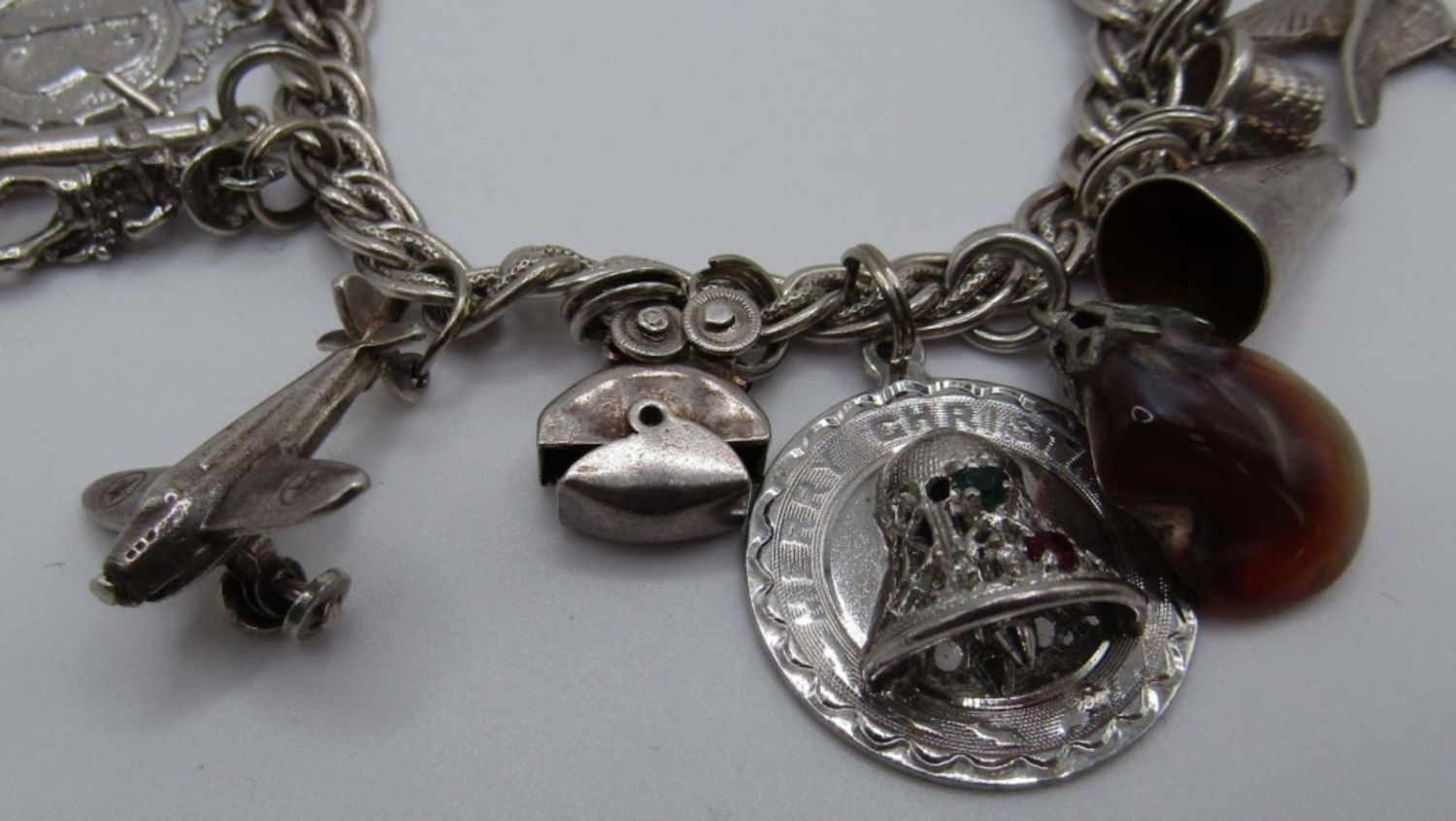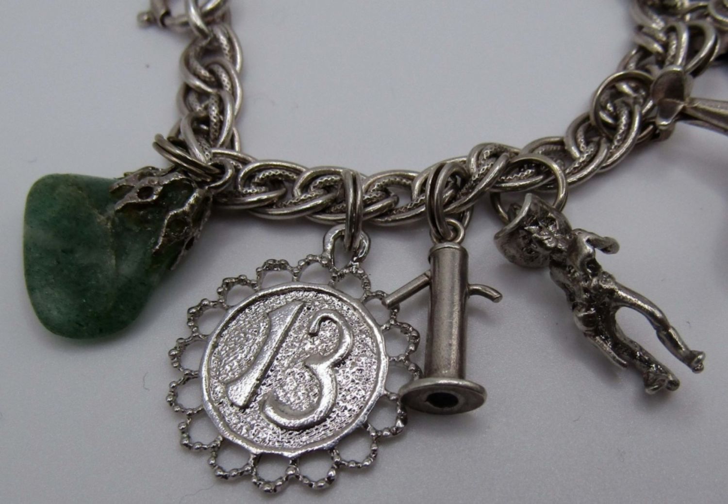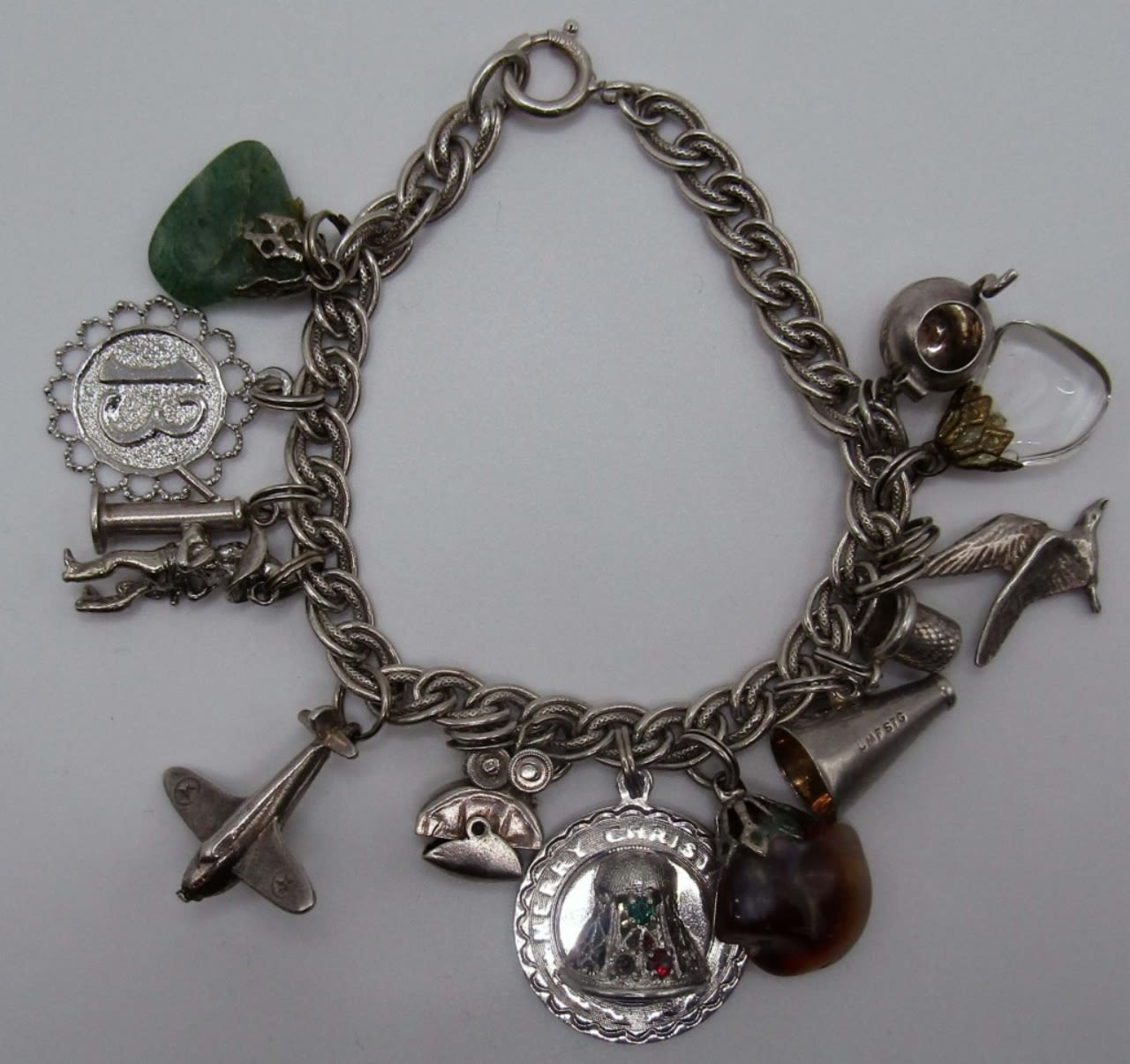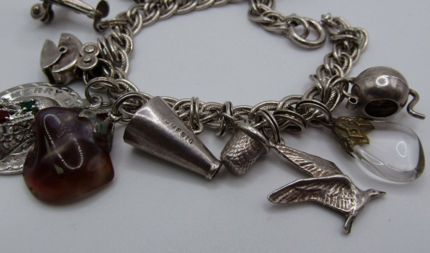 Vintage Sterling Charm Braclet measures at 7 in, mix of 13 Charms, 21 DWT