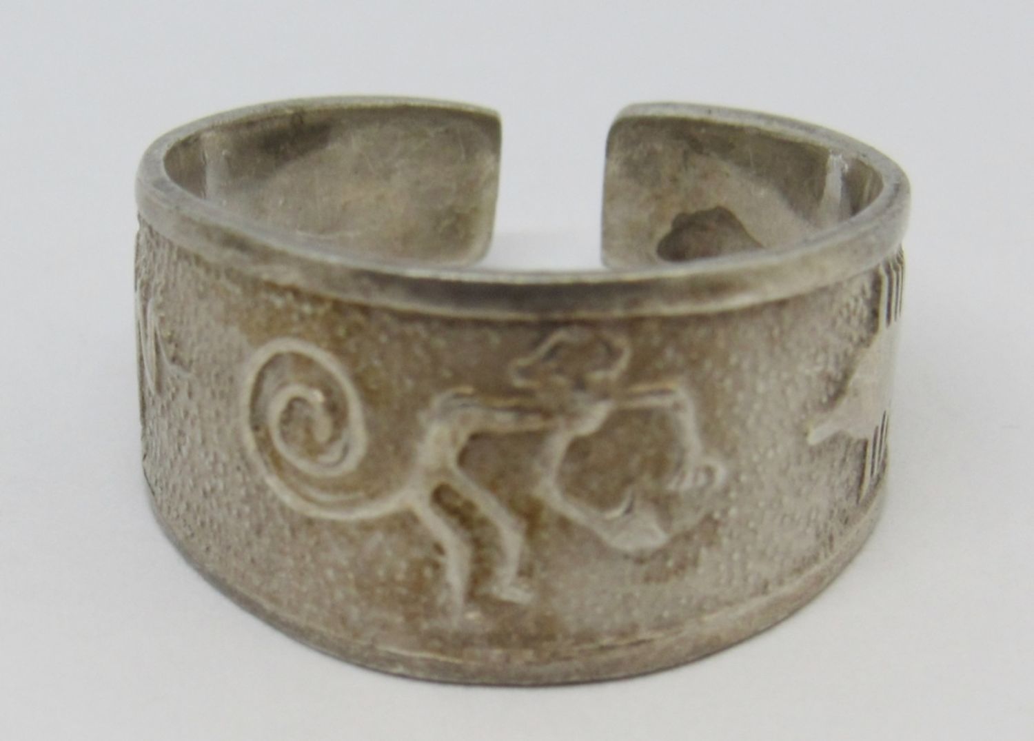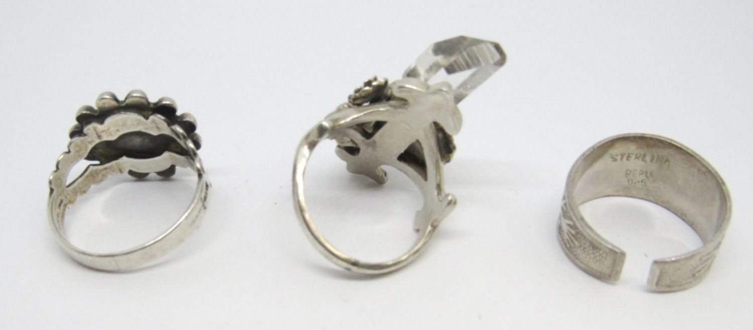 3-STERLING SILVER TONED FASHION RINGS WITH CARVED UNIQUE DESIGNS AND CRYSTAL, SIZES 6 1/2-7 (11.5 DWT)