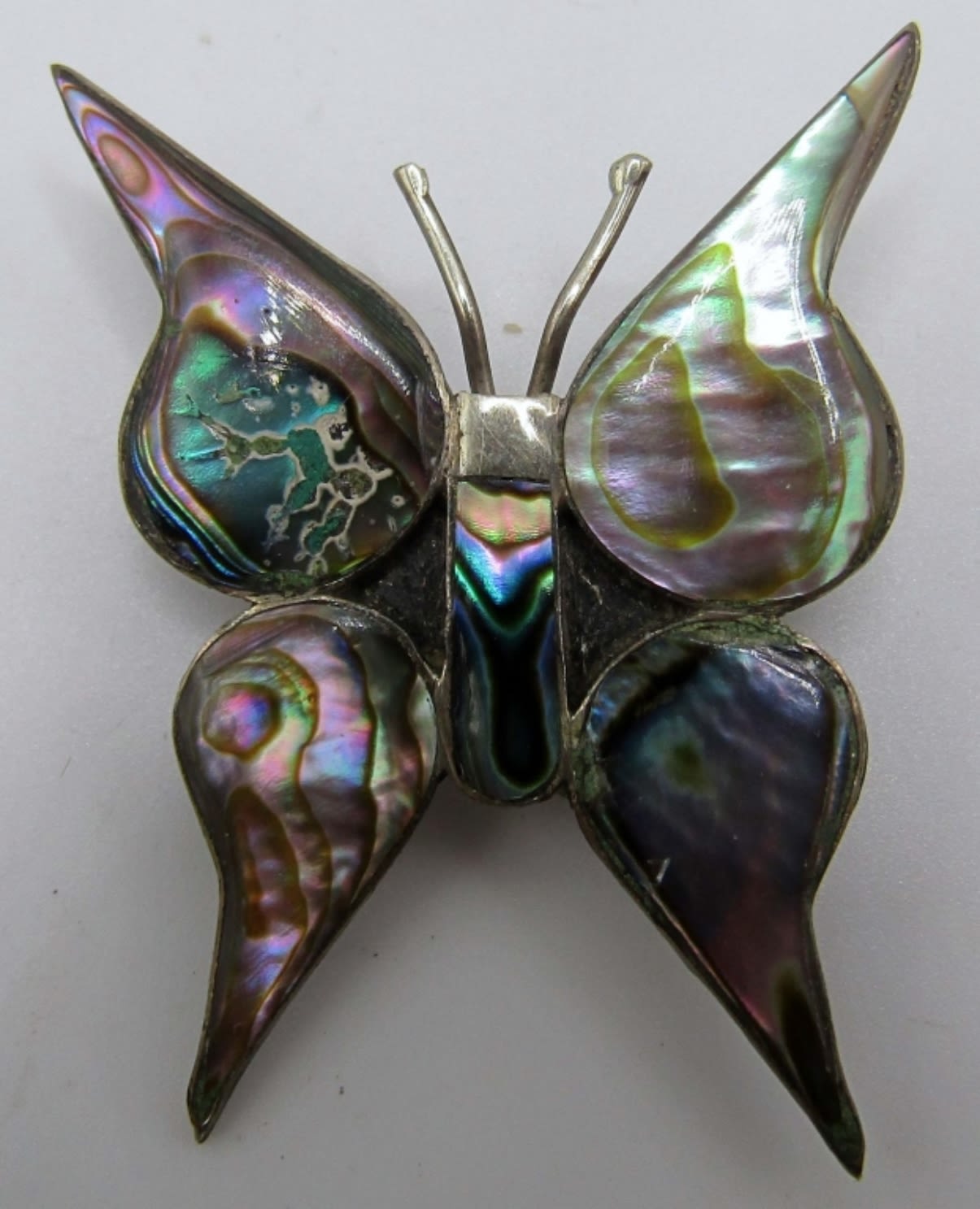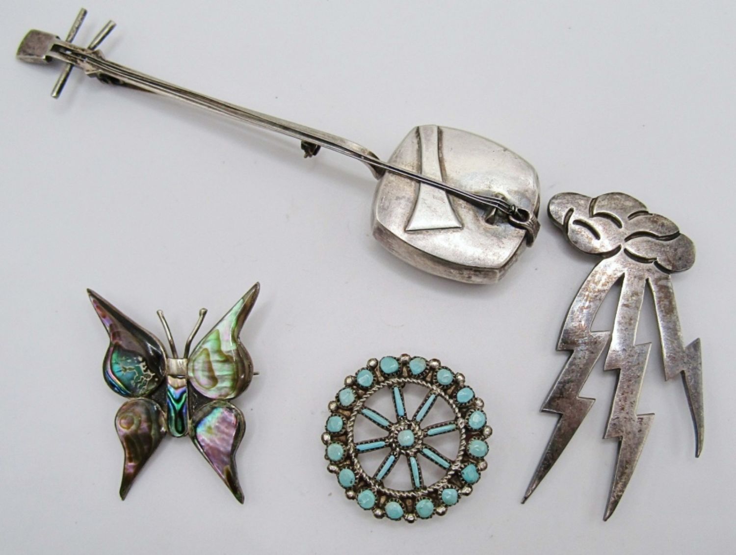 27dwt, Banjo 4in in length, Marked Sterling 950,Cloud and Lighting marked 925 mexico,turquoise round pin/pendent, Abalone Butterfly marked tz-0 and mexico